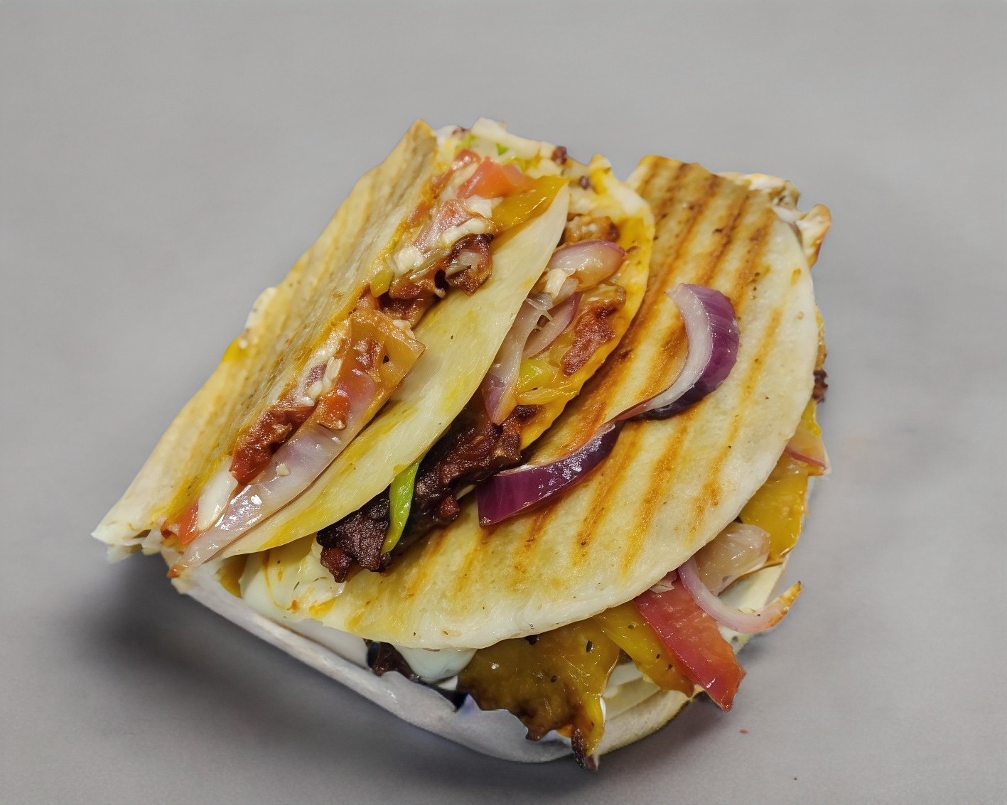Tortilla de harina al comal, pierna especial, milanesa empanizado, queso Oaxaca y cebolla morada curtida.