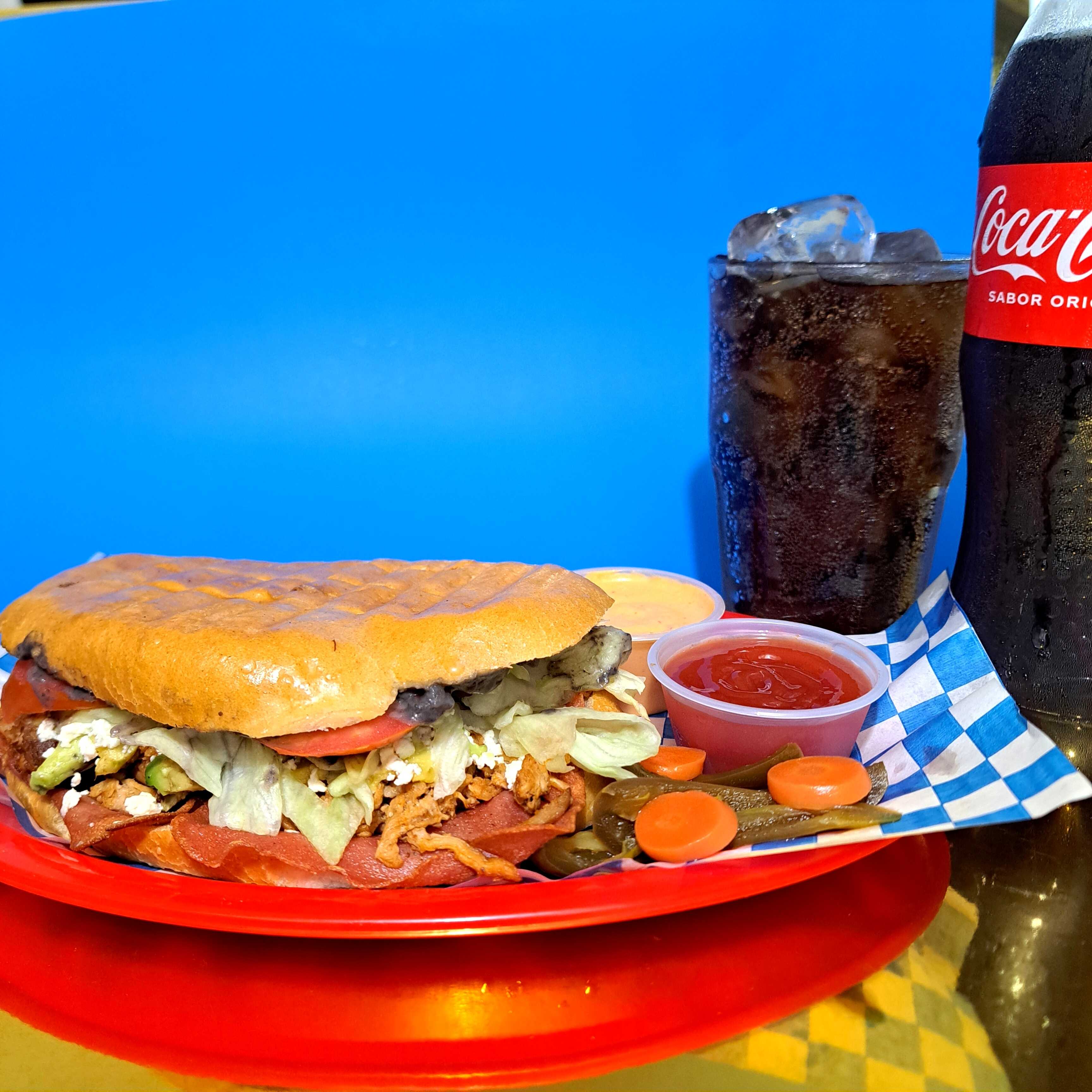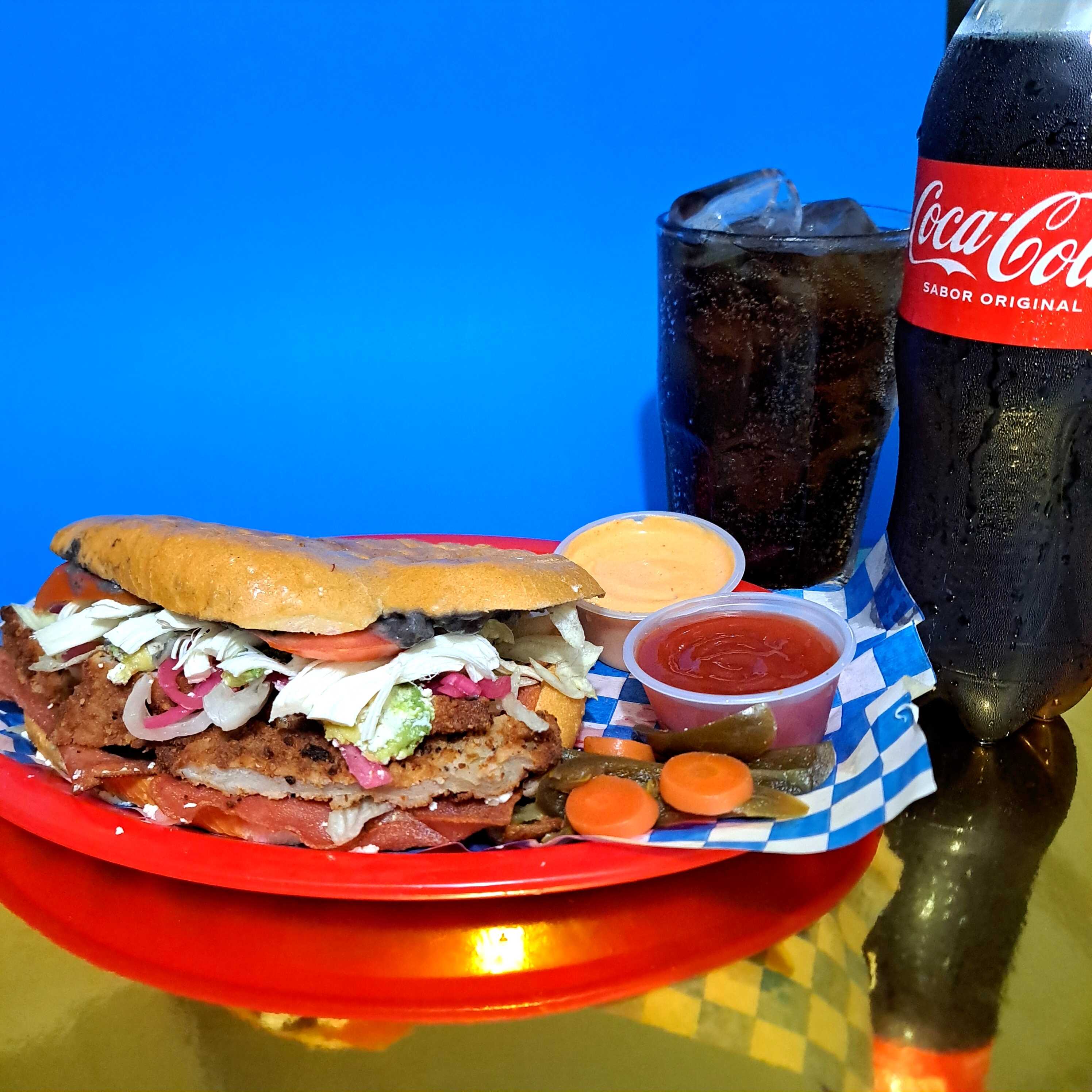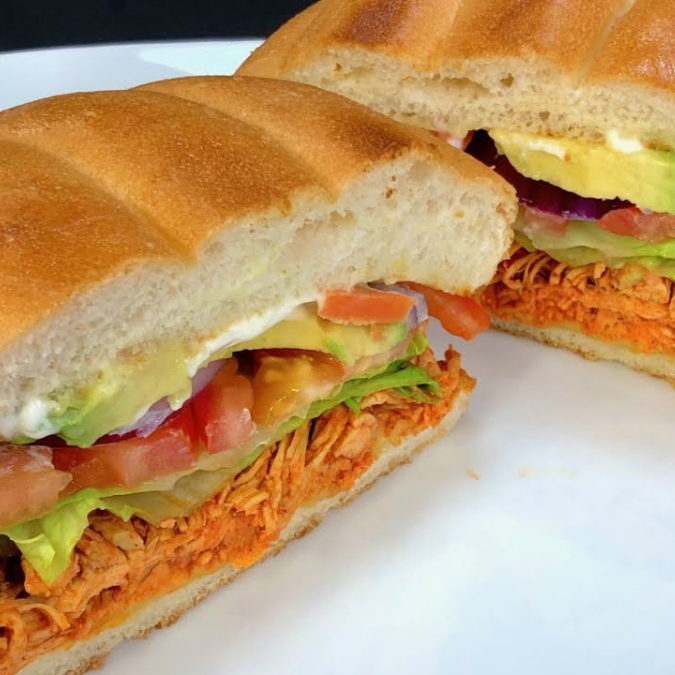 De Pollo con queso doble crema, jamón, tomate, cebolla curtida.