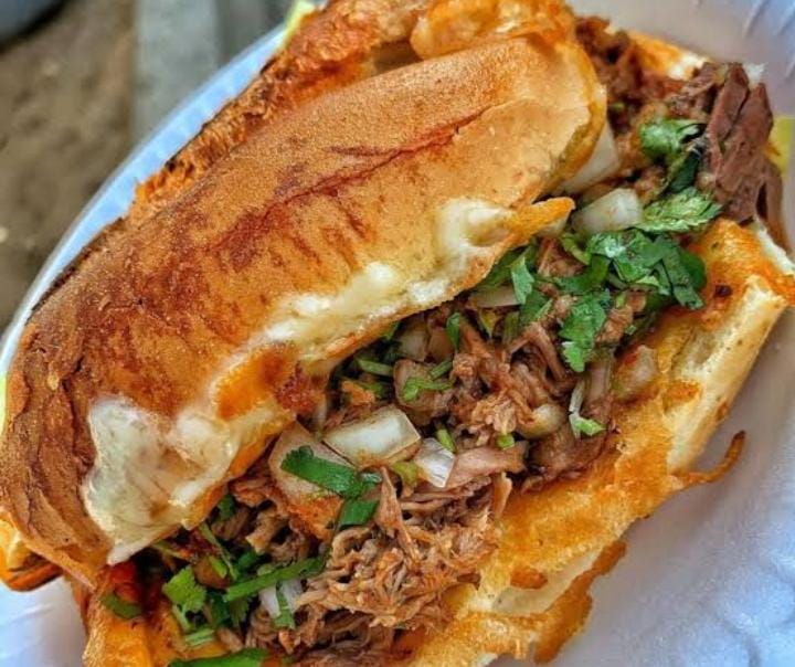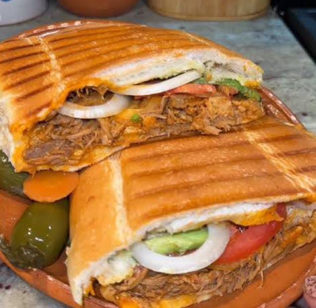 Torta grande rellena de pierna horneada, arrachera,queso americano y BBQ.