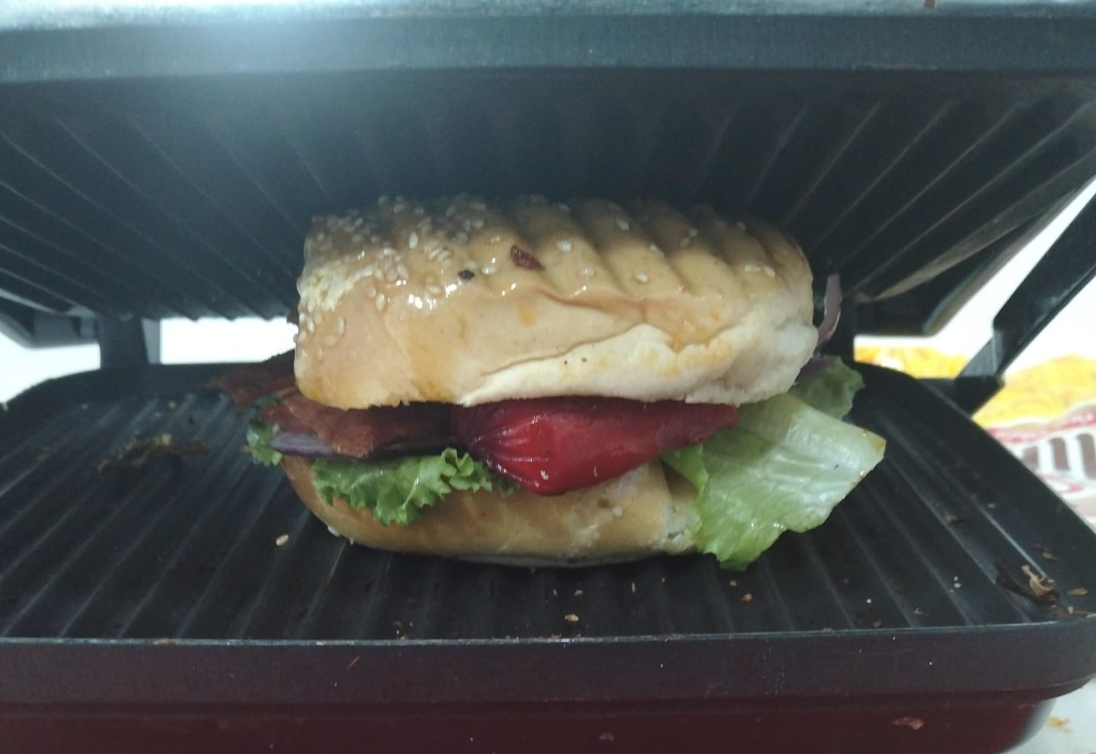 150gr, de carne sirloin, queso americano, tocino, salchicha de asar roja, lechuga, tomate, cebolla, mayonesa y catsu.