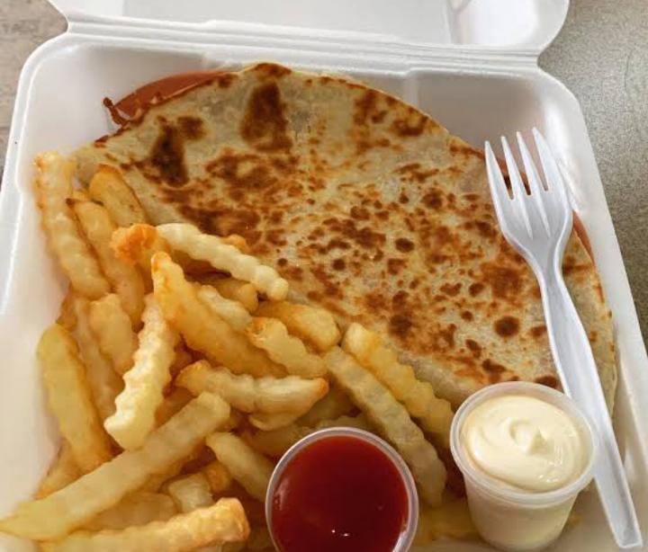 Orden de 3 gringas de pierna con jamón, y queso oaxaca ,acompañado con papas.