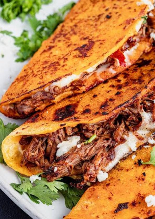 Orden de 3 gringas de asada con queso oaxaca, acompañado con papas.
