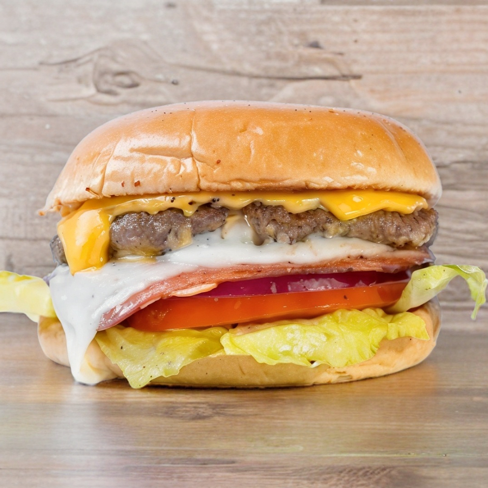 Carne de sirloin 150gr, jamón de pavo, queso amarillo, queso morzarella, lechuga, tomate, cebolla y papas a la francesa.