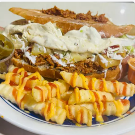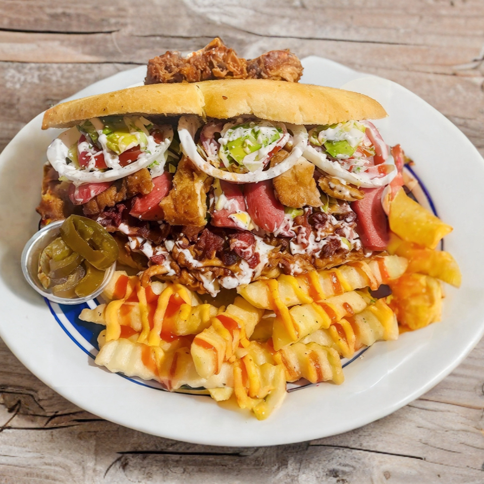 Empanizado de pollo, jamón de pavo, mayonesa, frijol, lechuga, tomate, aguacate, cebolla, queso doble crema, media crema y papas a la francesa. (Para máx. 2 personas)