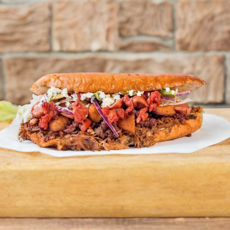 Doble carne de arrachera, salchicha roja, jamón de pavo, rodaja de pina queso oaxaca, aguacate, lechuga, tomate, cebolla asada y papas a la francesa.