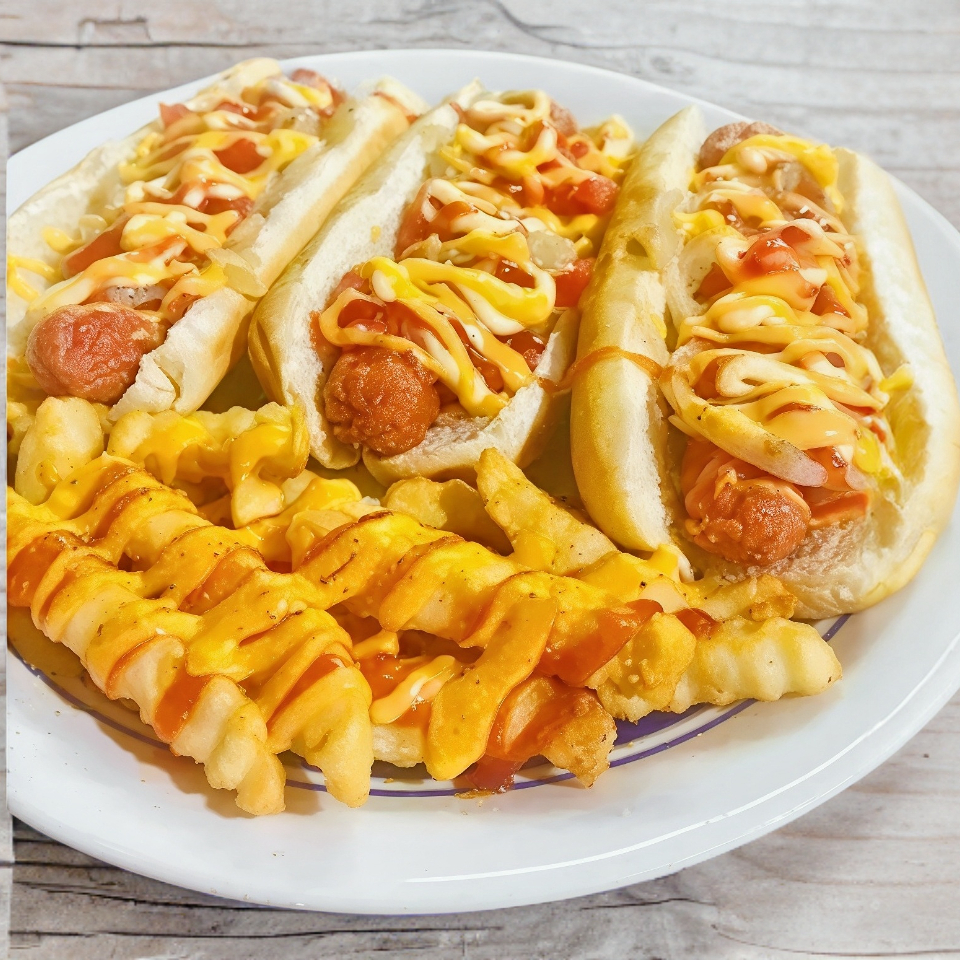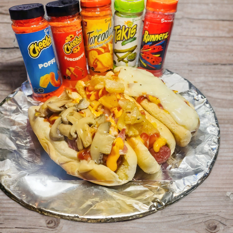 Salchicha de pavo, extra peperoni, queso fundido, queso cheddar, cebolla asada, mayones, catsup y papas a la francesa