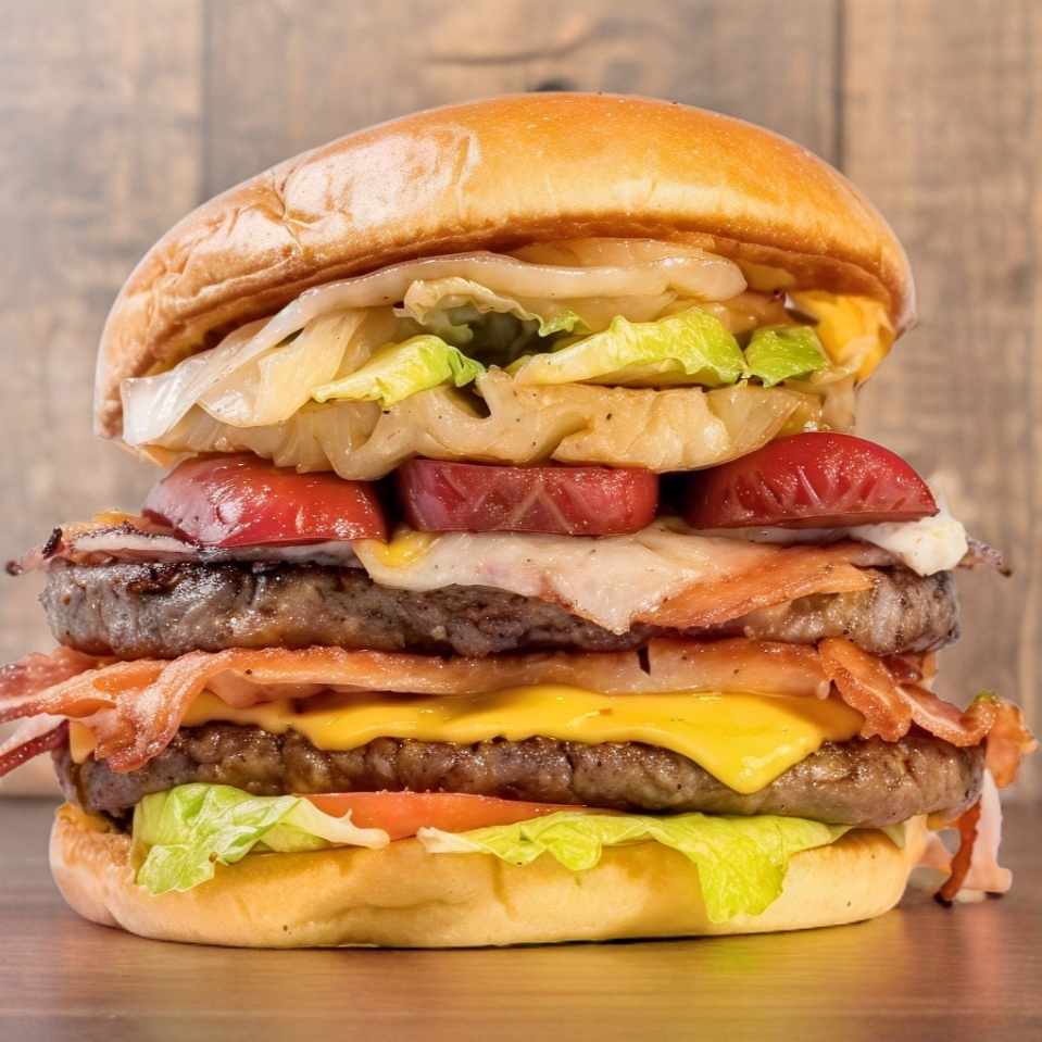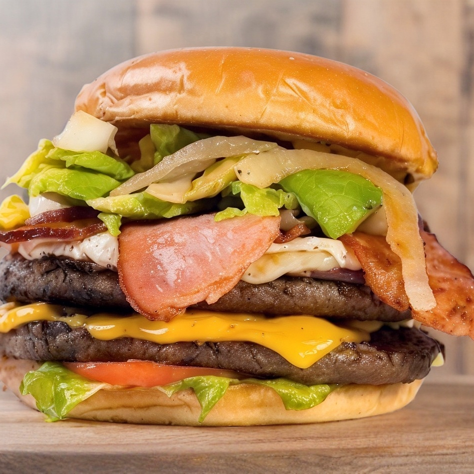 Doble carne de arrachera, extra-tocino, 3 jamón de pavo, queso amercano, queso mozzarella, extra-aguacate, lechuga, tomate, cebolla asada y papas a la francesa.