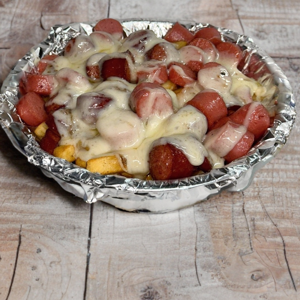 papas a la francesa 250gr, salchichas de pavo en rodajas, salchicha de res en rodajas, extra-queso fundido, queso cheddar, lemon pepeer, catsup