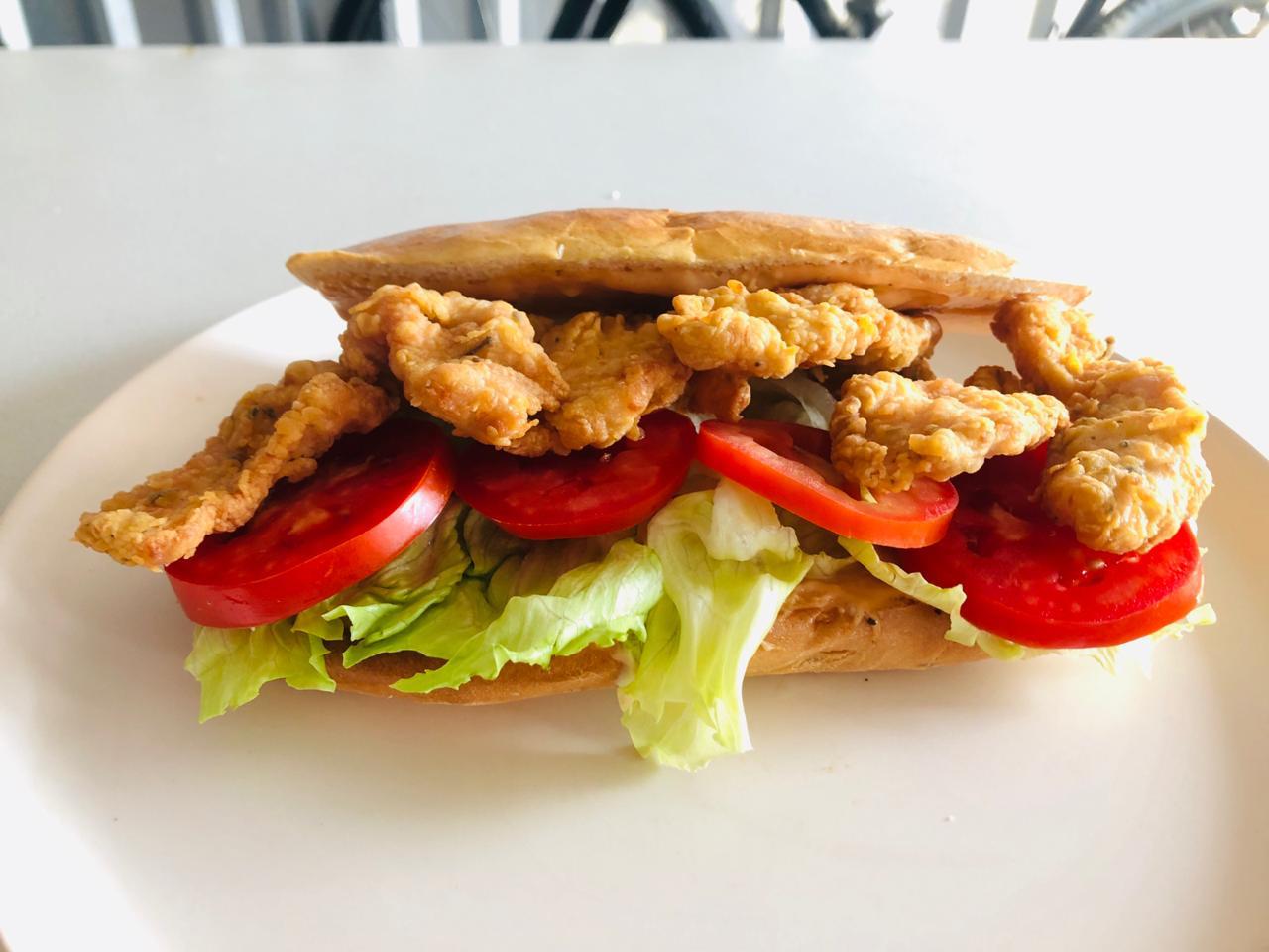 Nuestro pan artesanal, pechuga de pollo crocante, salsa golf, lechuga y tomate