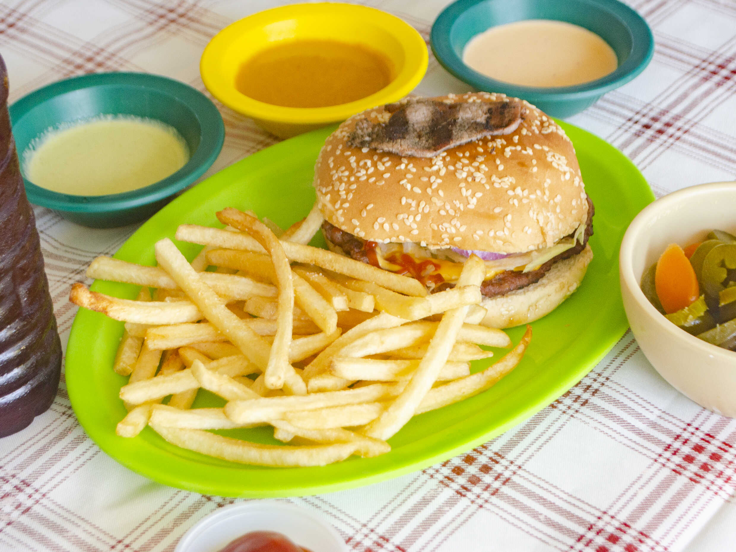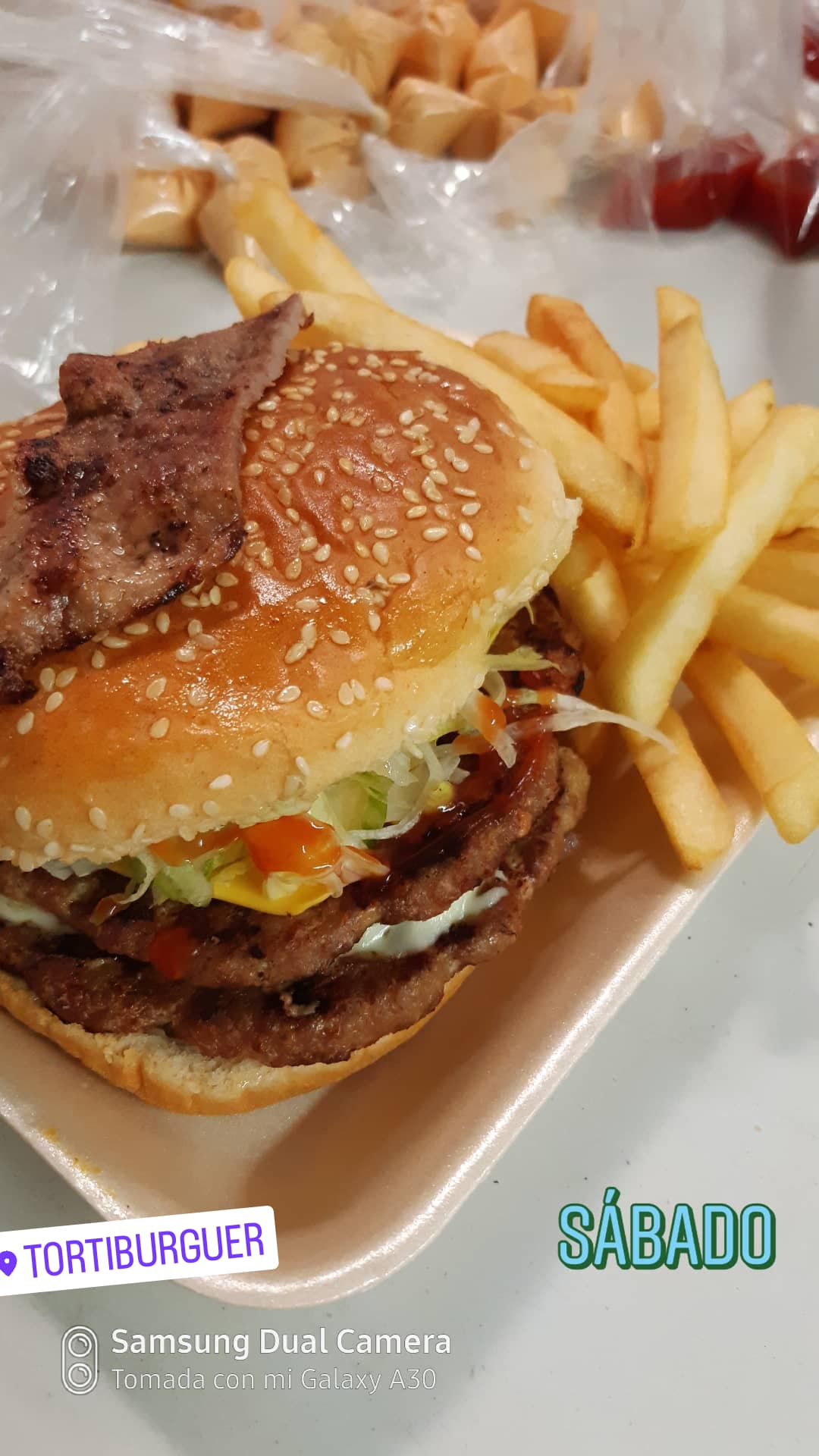 Doble carne de res, lechuga, tomate, cebolla, queso amarillo, aderezo.