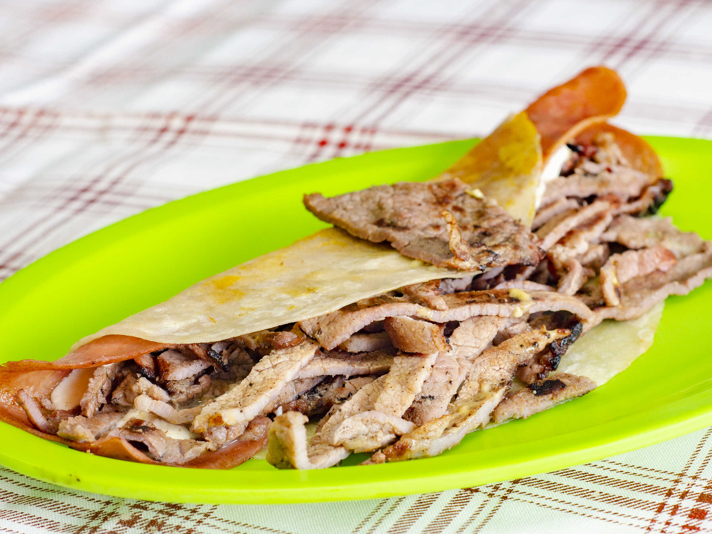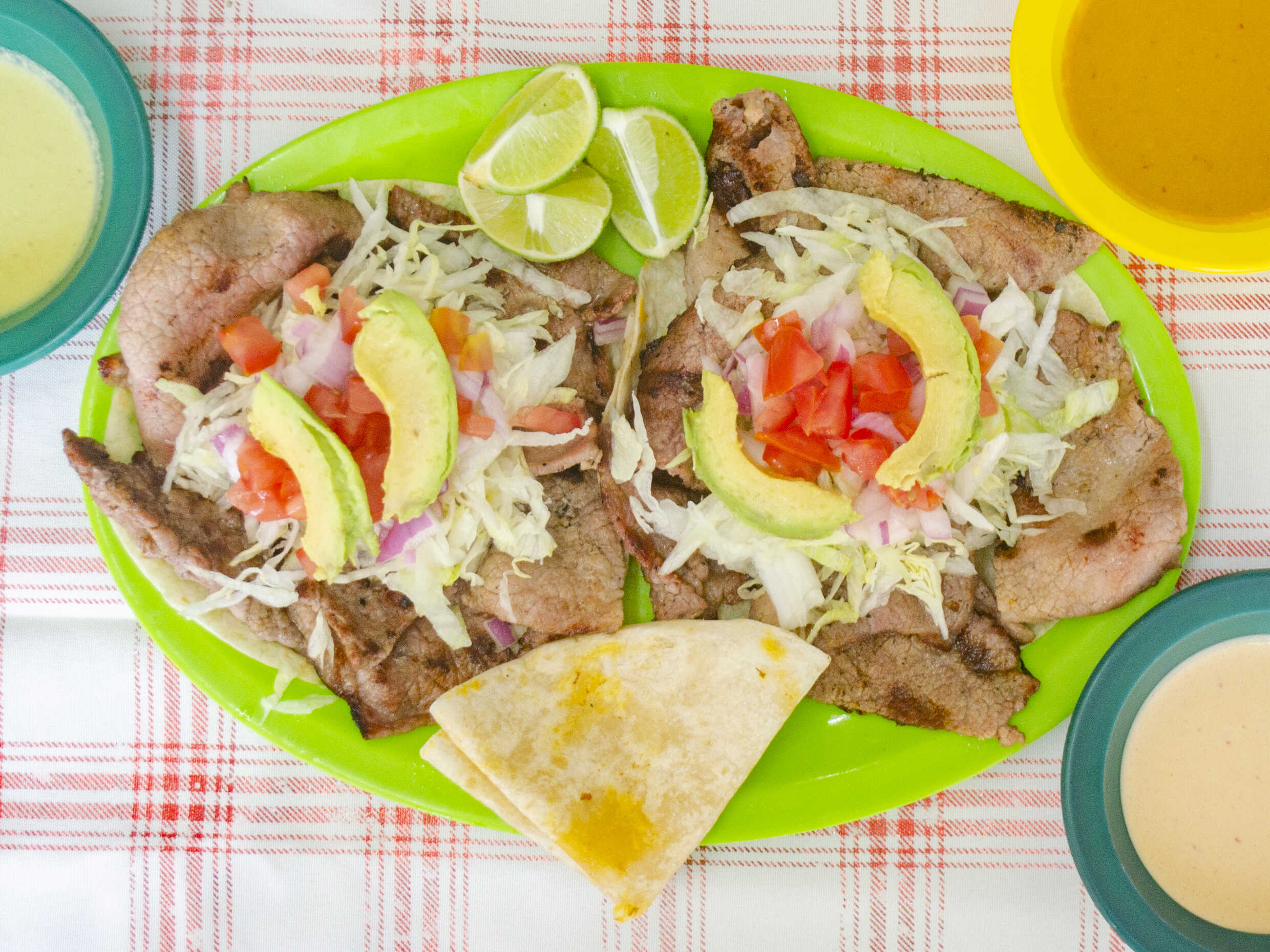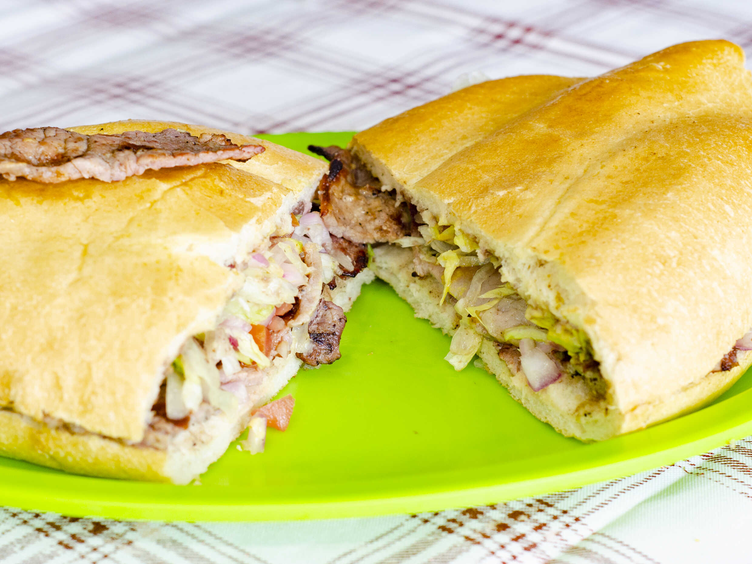 Carne de res, lechuga, tomate, cebolla, queso amarillo, aderezo.