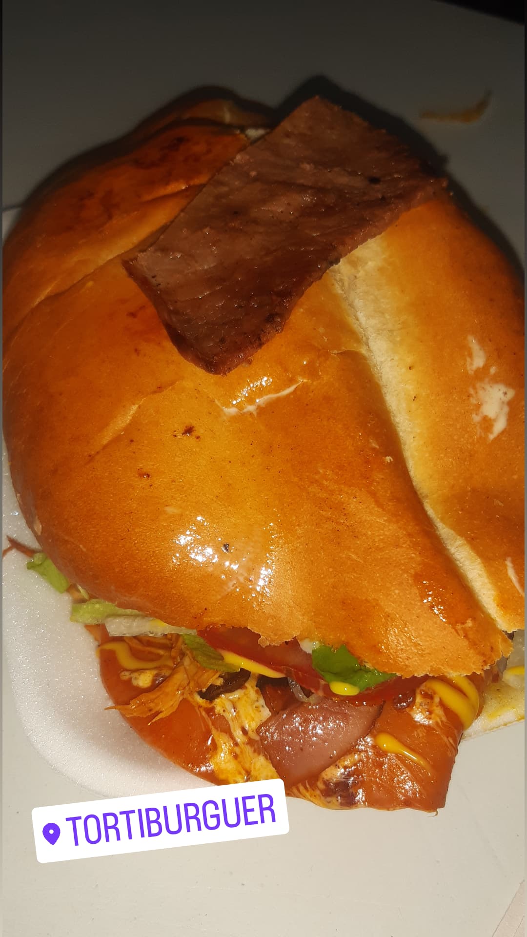 Doble carne de res, piña, lechuga, tomate, cebolla, queso amarillo, queso de hebra, aderezo.
