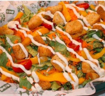Base de ensalada/ pechuga a la parrilla/ aderezo a elegir. Base de ensalada 330g. Lechuga, pimiento, tomate cherry, zanahoria crotones.