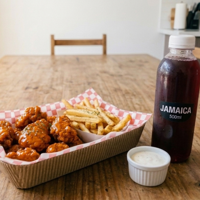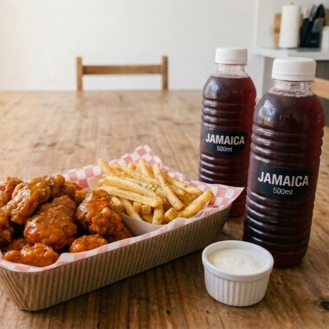 Agua de Jamaica 500 ML.*1 + 250 Gr de Boneless + 100 Gr Papas Fritas.*1