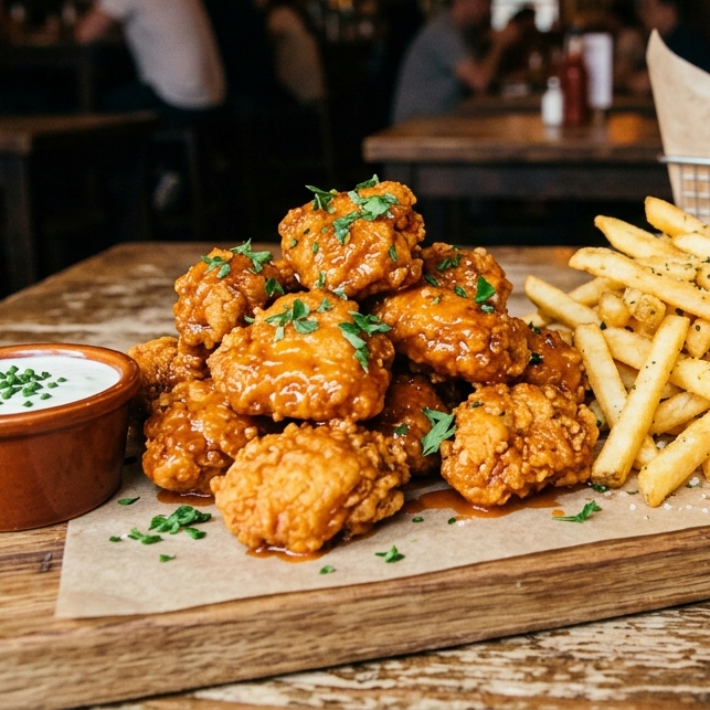 1kg de boneless bañado con 4 salsas a elegir, 400gr Papas a la francesa y aderezo a elegir (Todos los productos son pesados en crudo)
