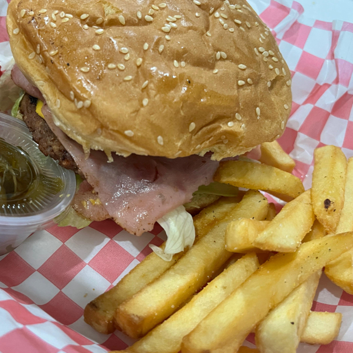 Carne de sirloin (150 gr), queso americano, piña, tomate, jamon de pavo y lechuga + porcion de papas