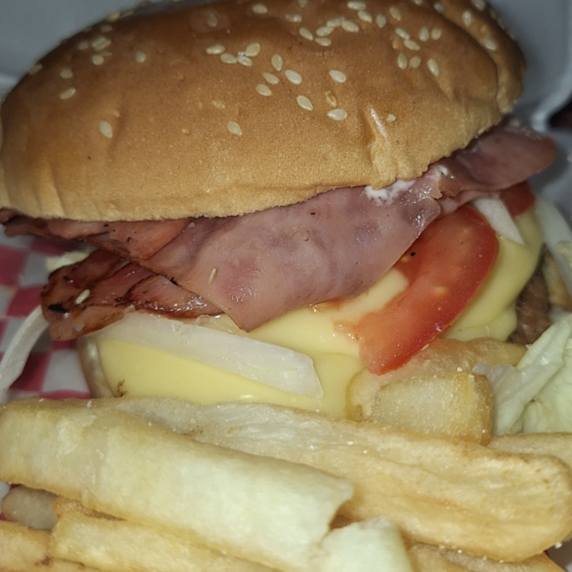 Carne de sirloin(150 gr), tocino crujiente, queso gouda, jamon de pavo, cebolla, tomate y lechuga + porcion de papas