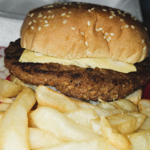 Carne de sirloin (150 gr), queso americano, jitomate, cebolla, lechuga, + porcion de papas