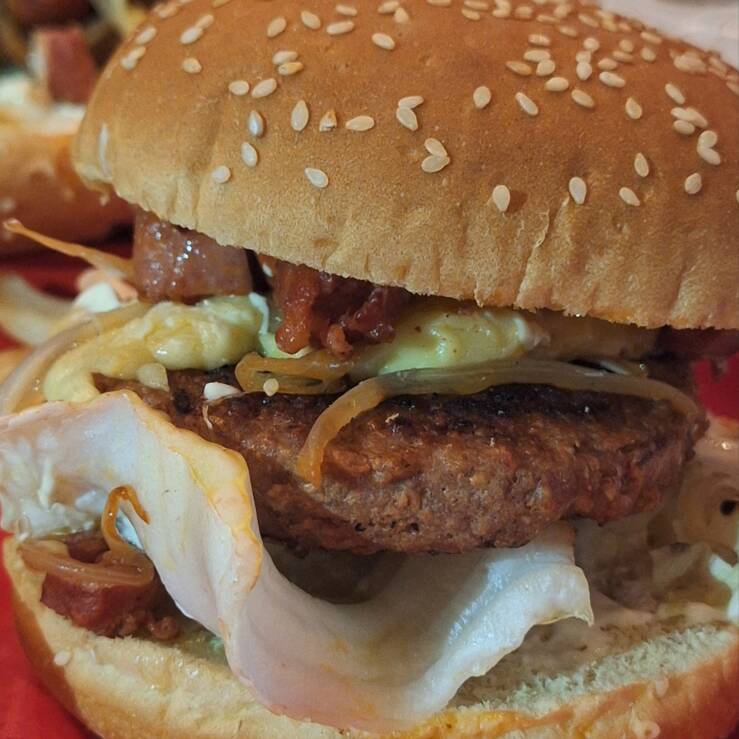 Carne de sirloin (150 gr), queso gouda, tocino, chistorra, chorizo argentino, lechuga, cebolla asada + porcion de papas