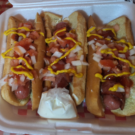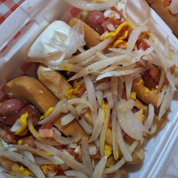 Salchicha envuelta en tocino, cebolla, tomate, catsup, cebolla asada.