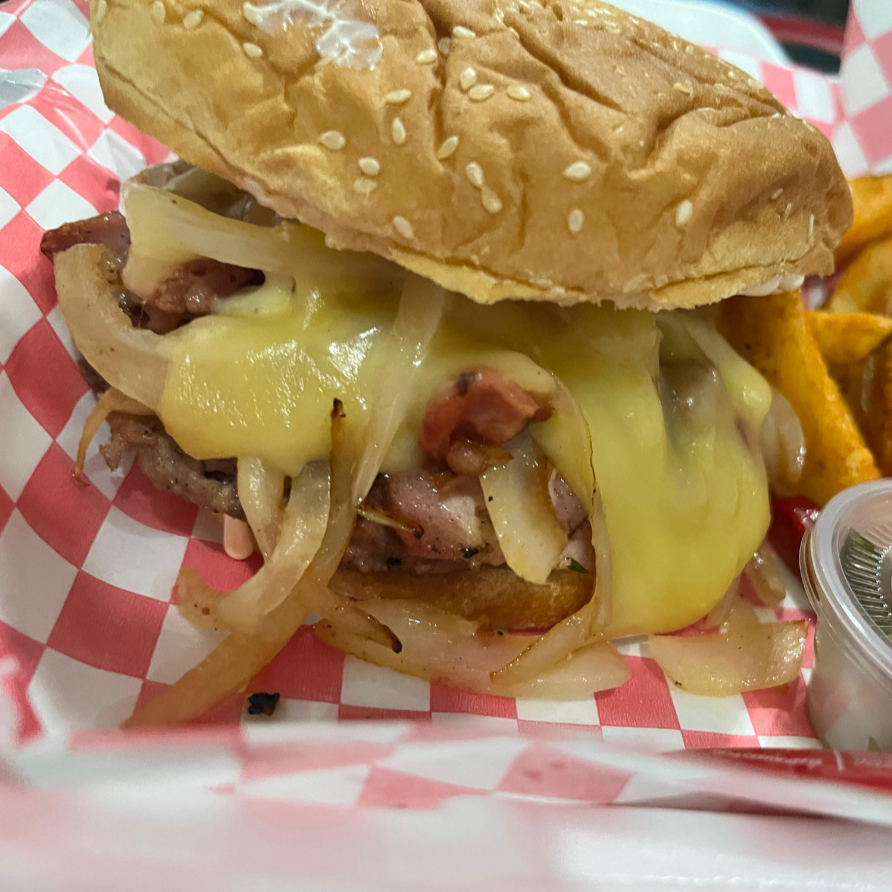 Carne de sirloin (150 gr), queso americano, queso gouda, salchicha alemana, tomate, cebolla asada, lechuga + porcion de papas