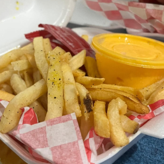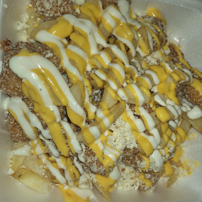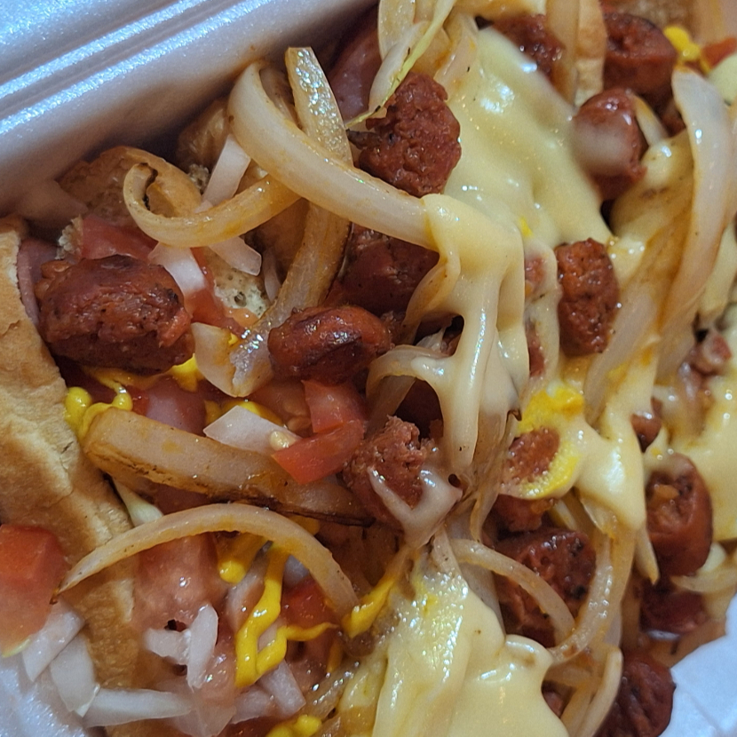 Trocitos de salchicha de pavo y papas a la francesa (260 gr) bañados en queso cheddar y catsup.