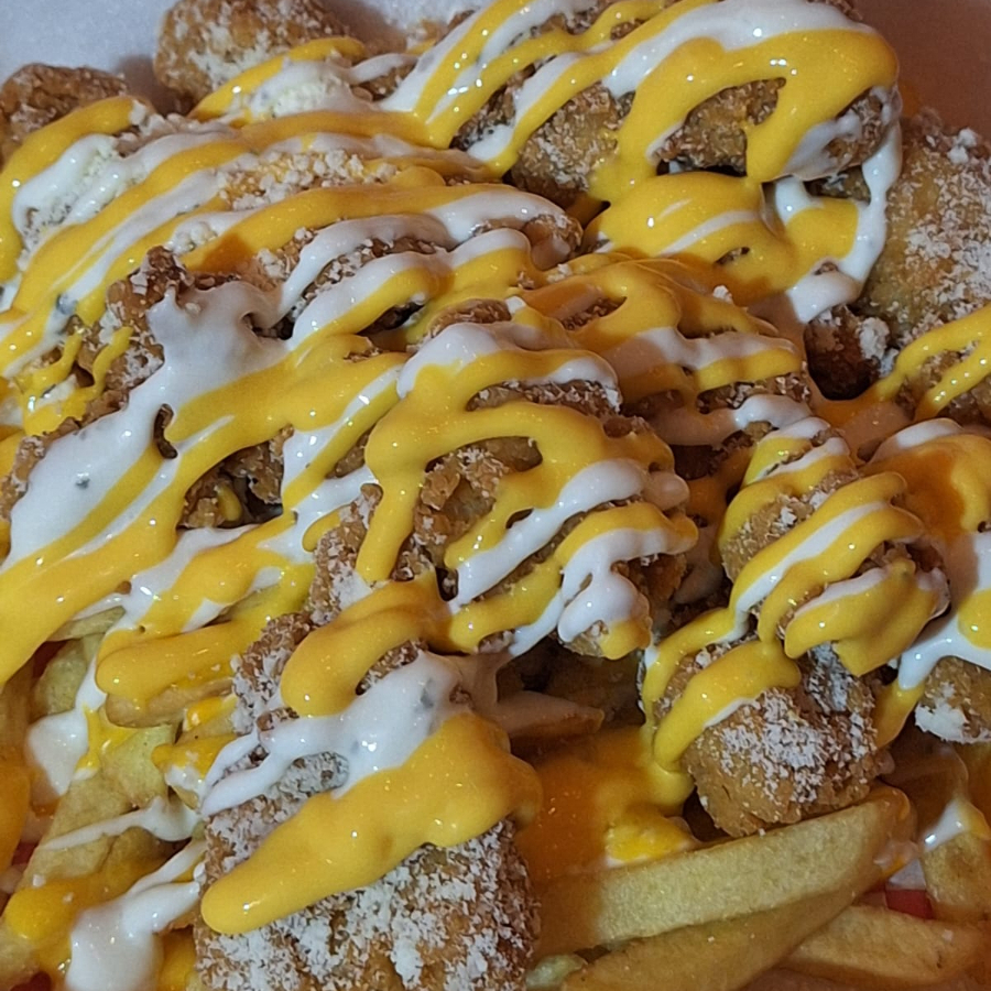 350 gr de papas francesas + 400 gr de boneless bañados en ranch y cheddar