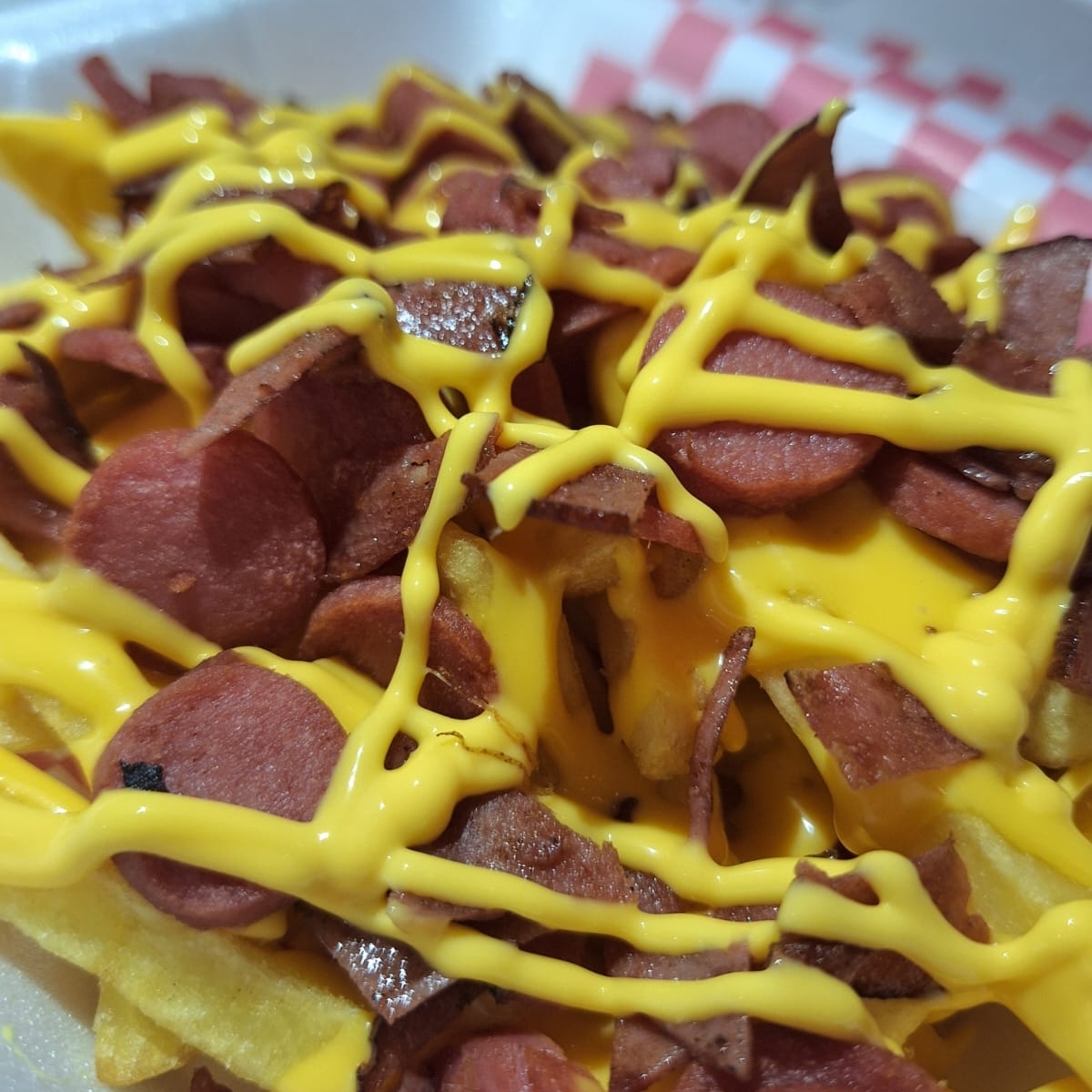 Trocitos de salchicha de pavo, tocino y papas a la francesa (300 gr) bañados en queso cheddar y catsup.