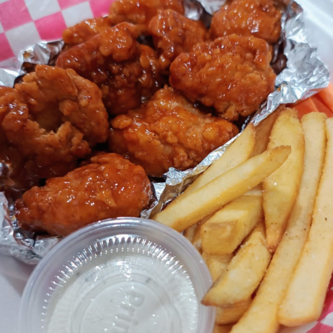 260 gr de papas francesas + 250 gr de boneless bañados en ranch y cheddar