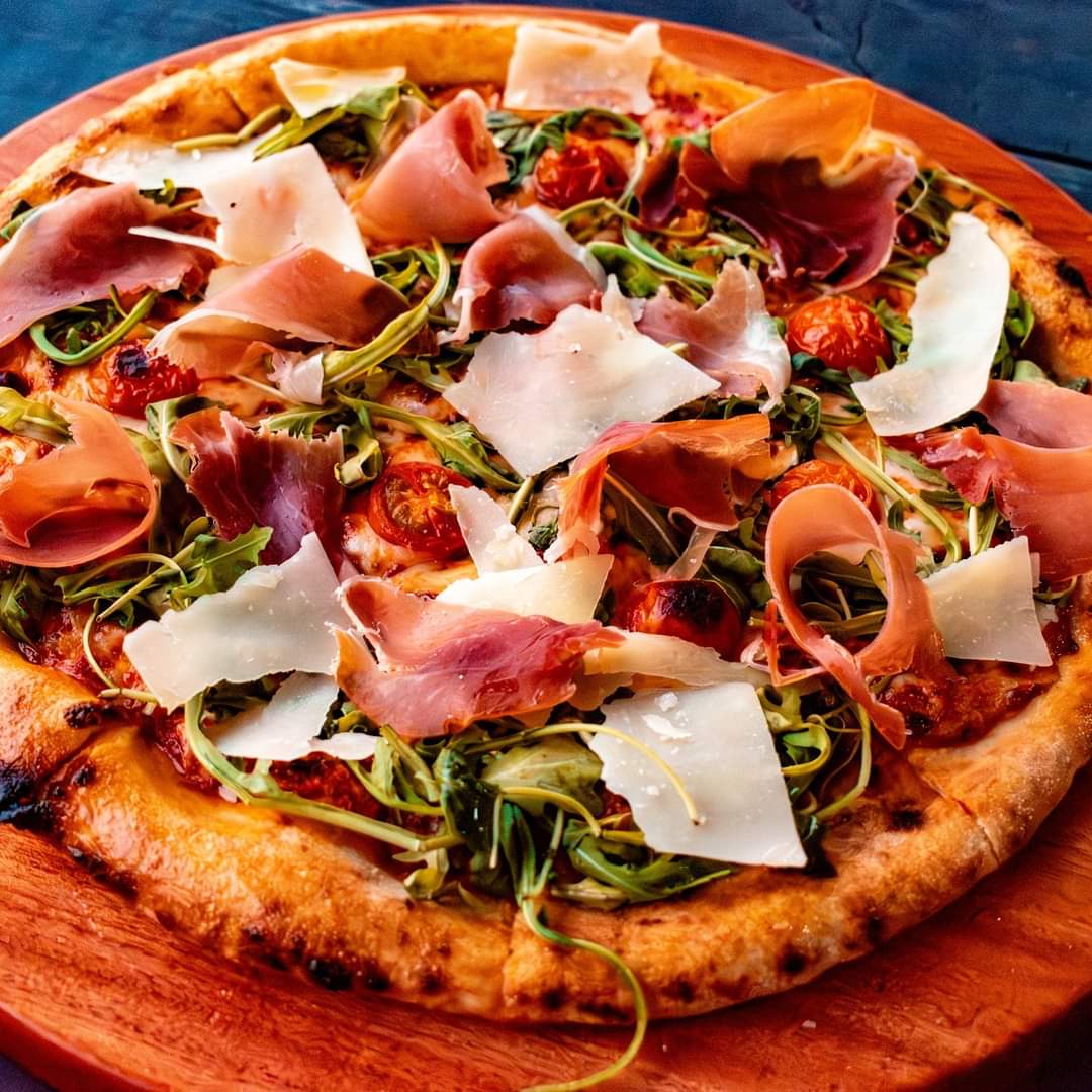 Delicada combinación de prosciutto, arúgula, láminas de parmesano, mozzarella, jitomate cherry y aceite de oliva extra virgen