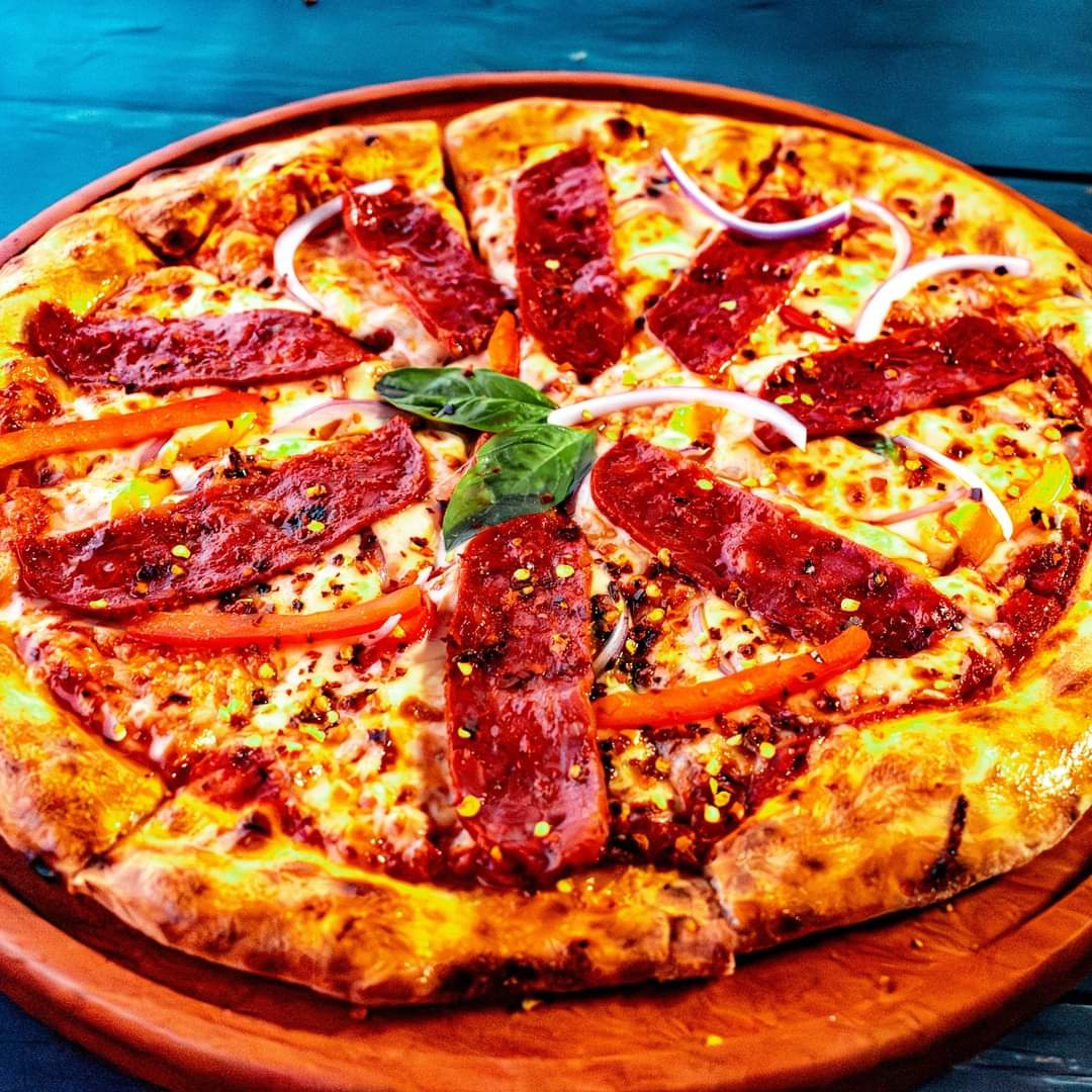 Delicioso e intenso salami del sur de italia, queso mozzarella gratinado, pimientos, cebolla morada y un toque picante de hojuelas de chile