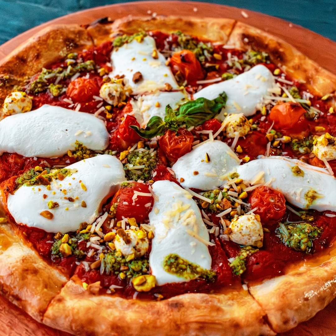 Increíble combinación de mozzarella fresco, jitomates cherry, parmesano, queso de cabra con pistaches tostados y pesto de albahaca genovesa