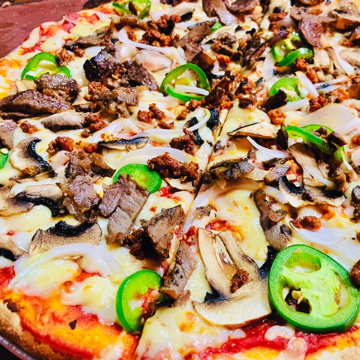 Jugosas lajas de sirloin, chorizo ahumado, queso mozzarella, champiñones, cebolla y rodajas de jalapeño