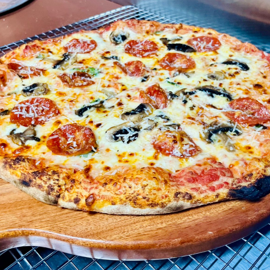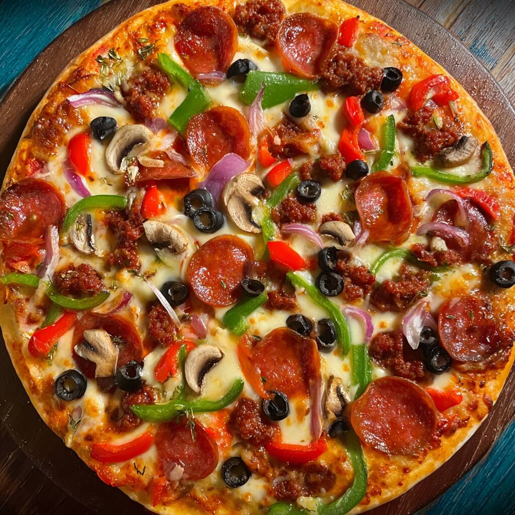 Suprema combinación de pepperoni, chorizo, salchicha ahumada de ajo, mozzarella, pimientos, aceitunas, champiñones y cebolla