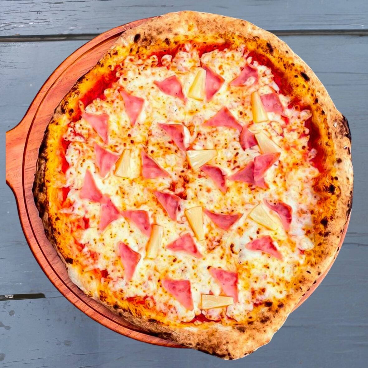 ¡La que no puede faltar! Con salsa de tomate, queso mozzarella, jamón de pavo y trozos de piña