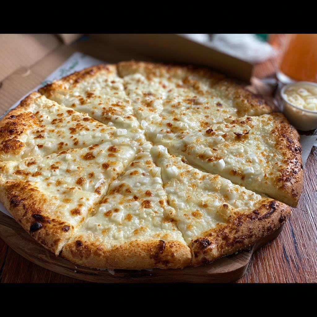 Base de crema de ajo cubierta con queso mozzarella gratinado y cebolla finamente picada caramelizada lentamente en nuestro horno de leña