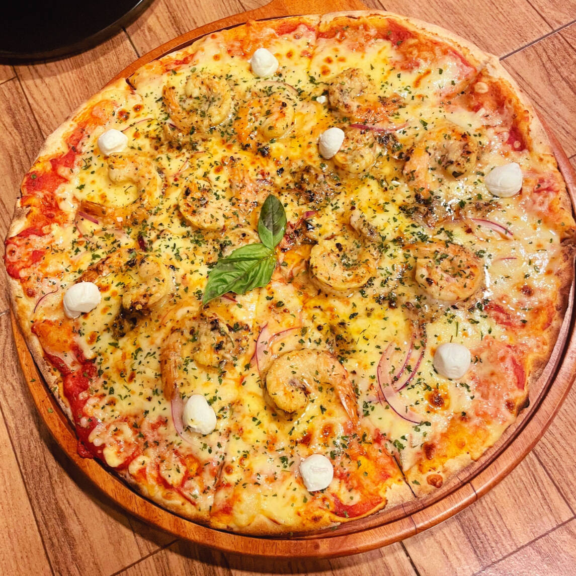 Con camarones al ajillo, queso mozzarella, queso de cabra, pepperoncino, cebolla morada, perejil y queso parmesano. Una explosión de sabor en cada bocado.