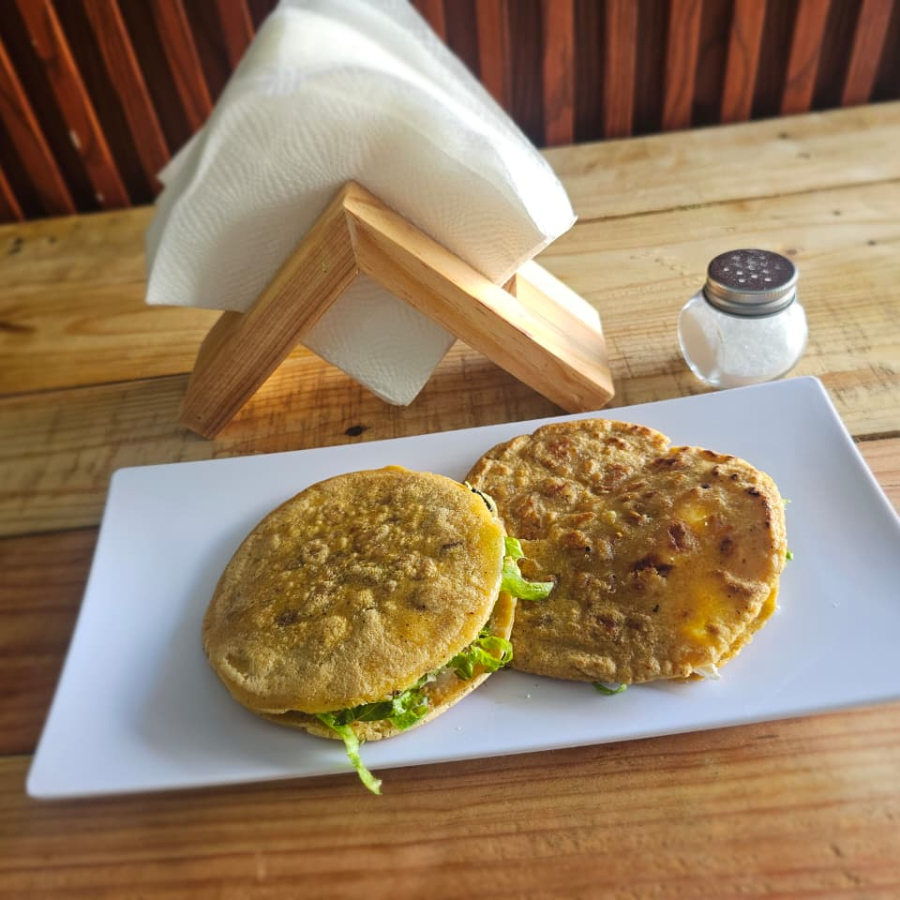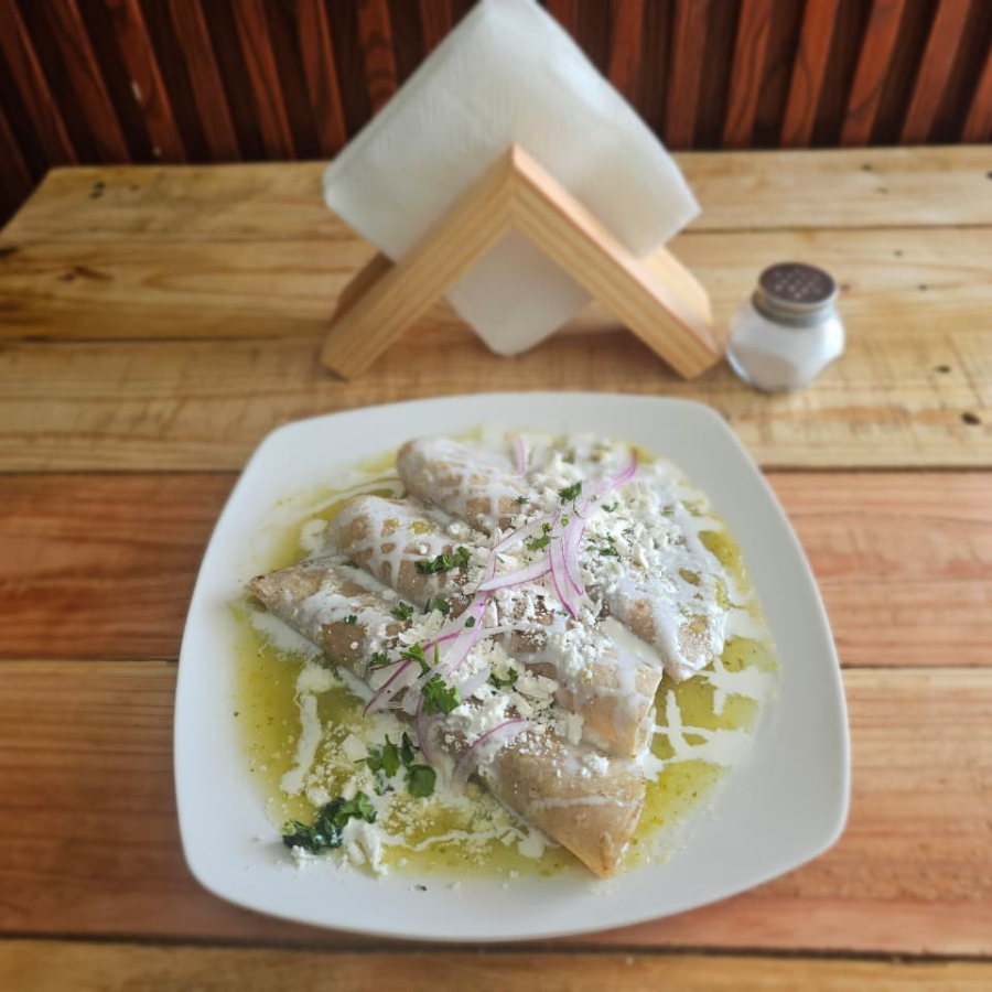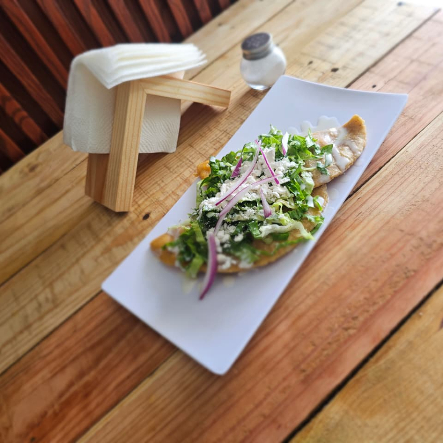 Rellenas de pollo, bañadas en salsa a elegir, con lechuga, queso, crema con cebolla