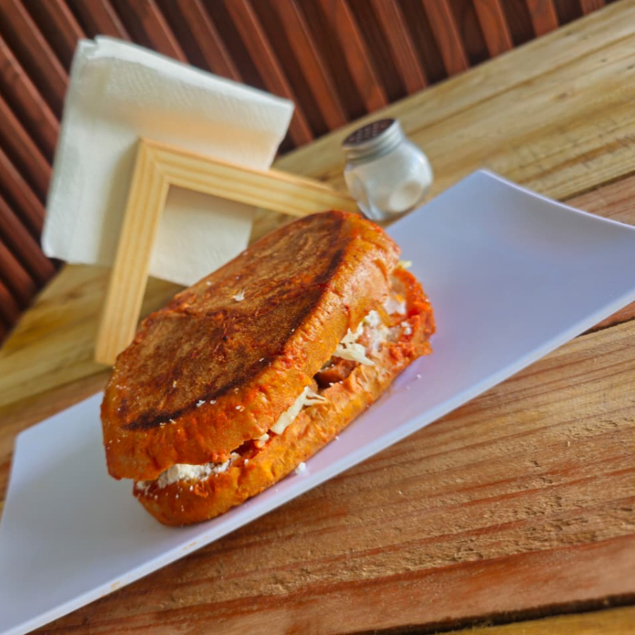 El pambazo estilo Edomex, diferente pan, bañado en salsa roja (no picante), relleno de papa con longaniza, lechuga, queso y crema