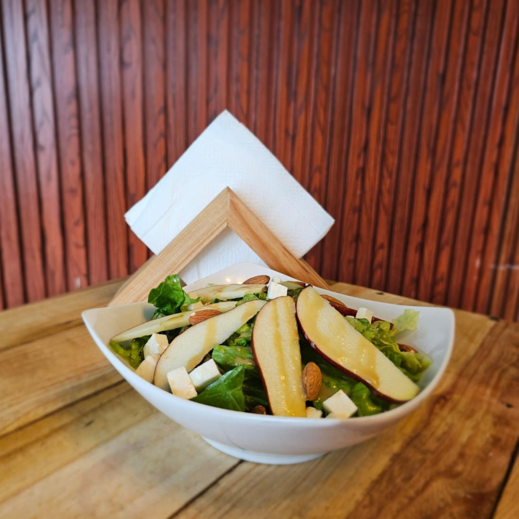 Mix de lechugas con manzana verde, queso fresco, almendra caramelizada, con aderezo de miel-mostaza