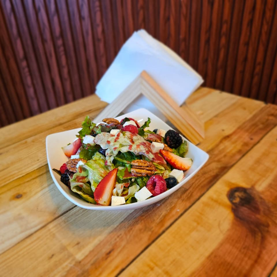 Mix de lechuga con mezcla de frutos rojos, nuez caramelizada, con aderezo de frutos rojos