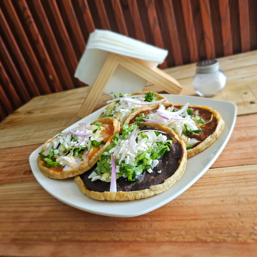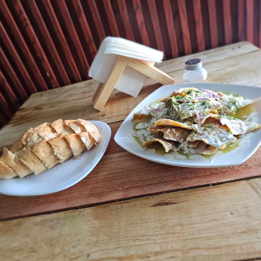 totopo de maíz, bañado en salsa verde o roja acompañados con frijoles y encima queso, crema y cebolla