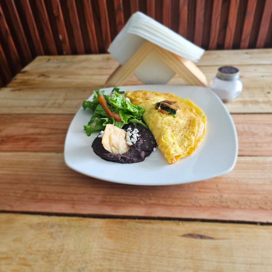 Preparado con champiñones y queso acompañado de frijoles refritos y totopos