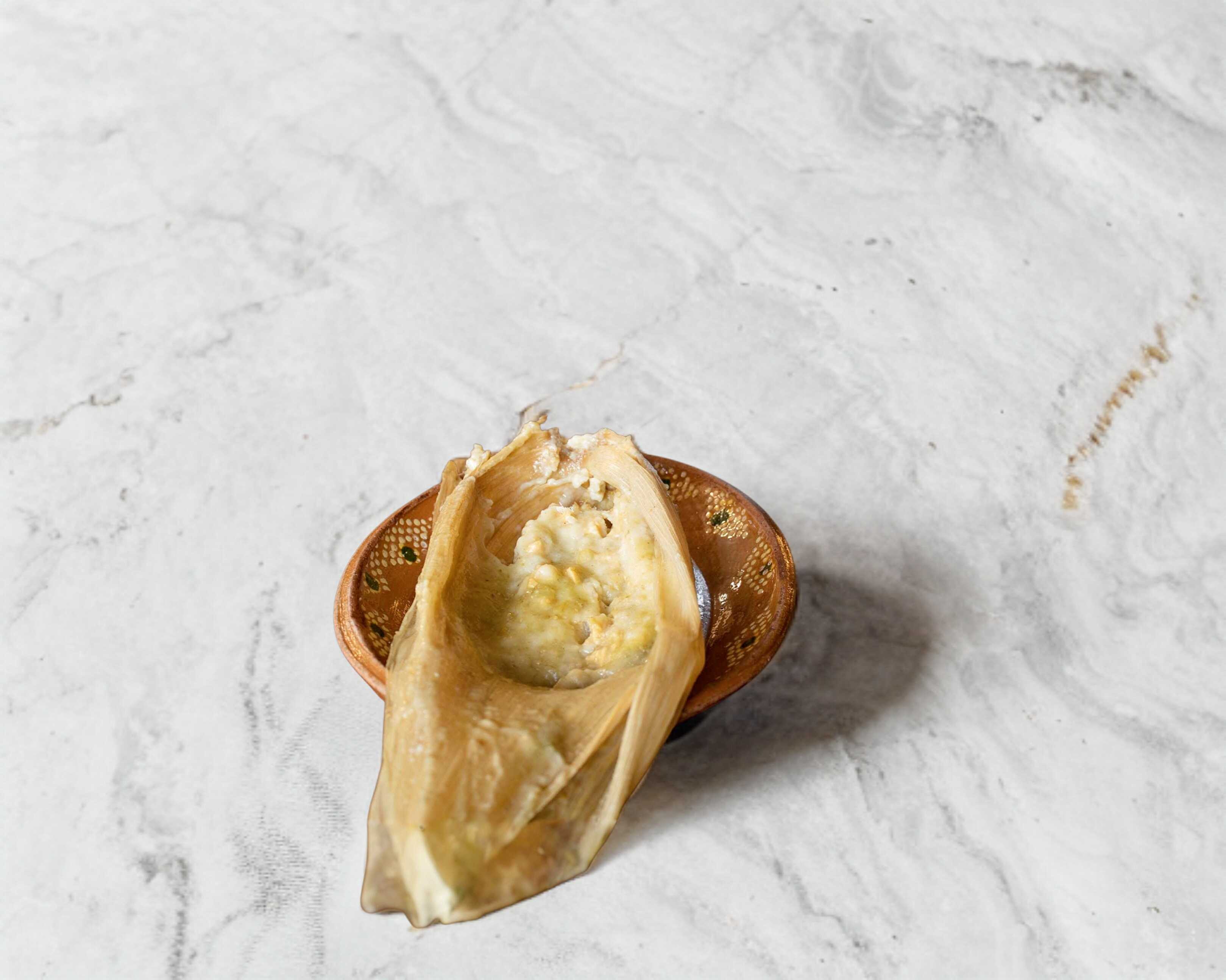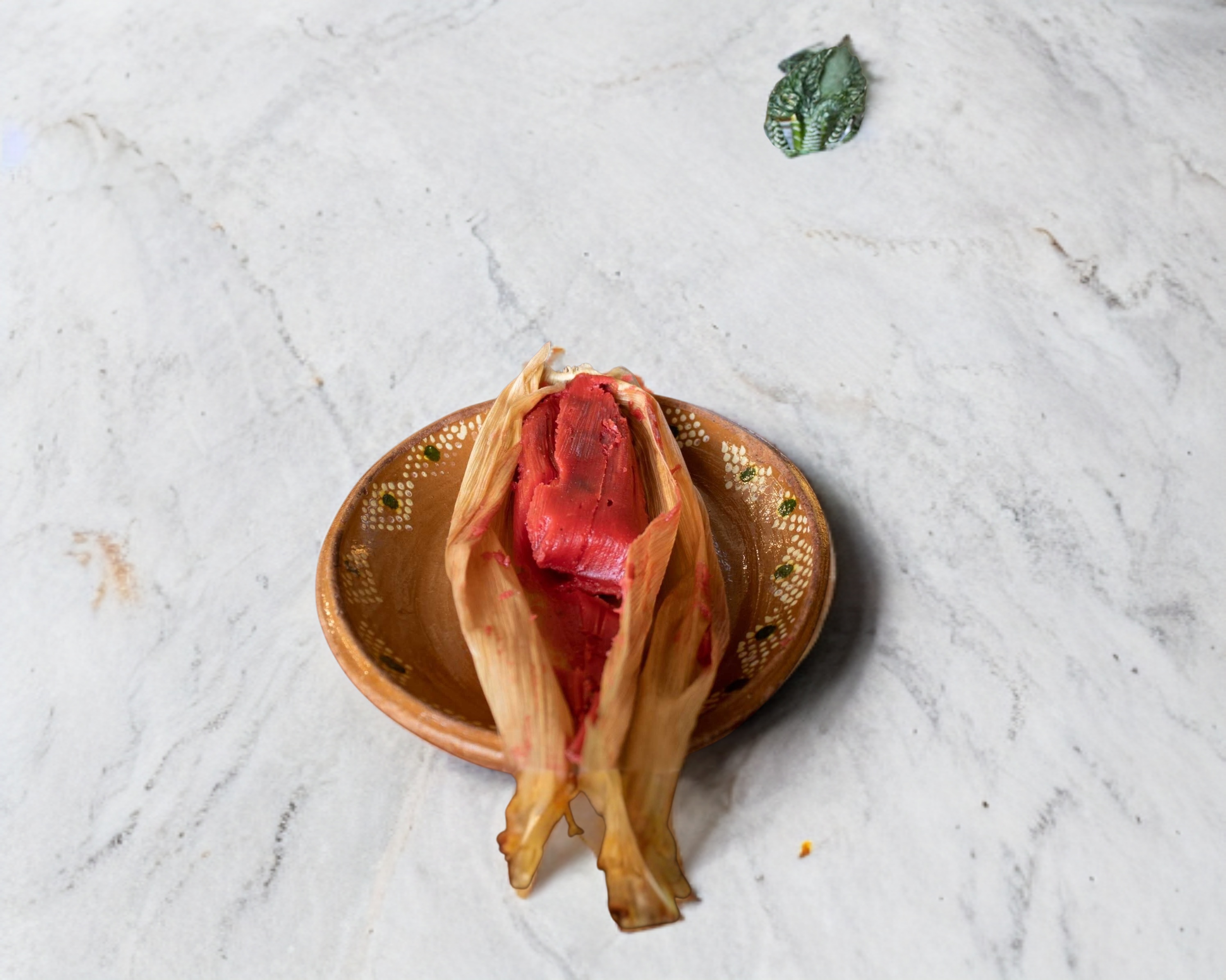 Exquisita combinación de masa de elote dulce con salsa roja y costilla de cerdo.