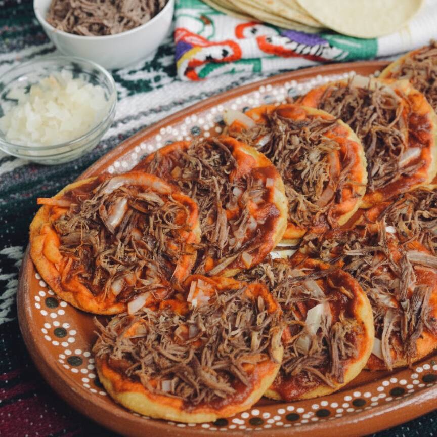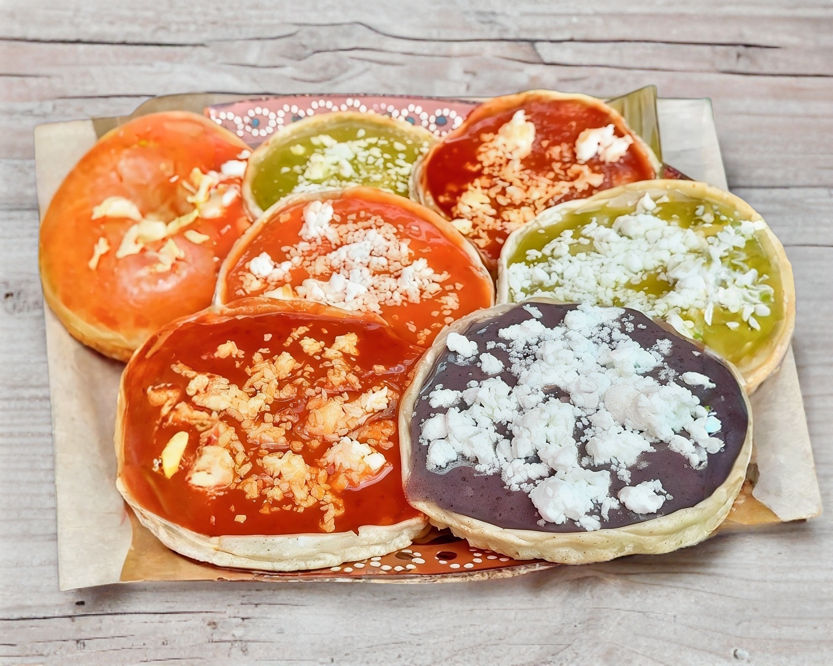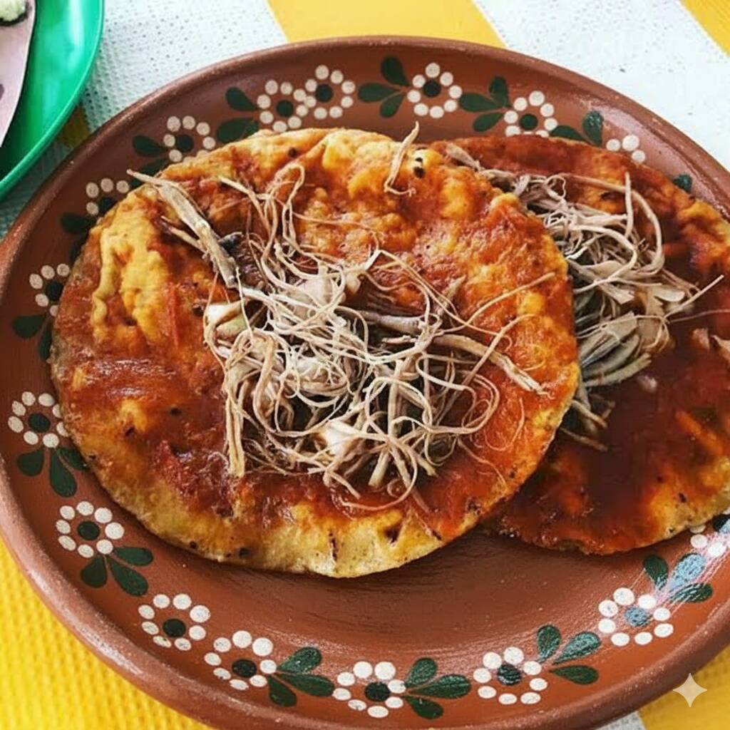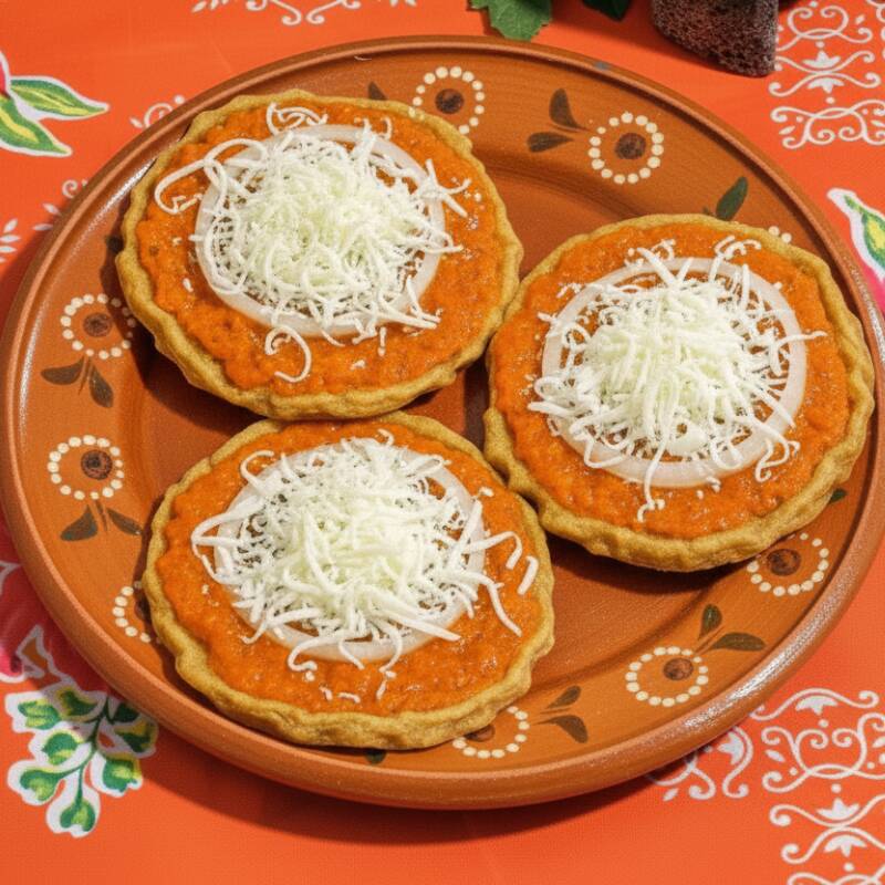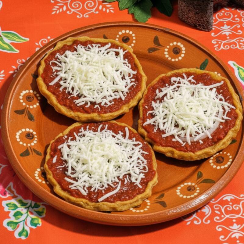 Masa recién hecha, pellizcada en las orillas y doradita al comal. Bien bañada en salsa de chile seco, con chicharrón o papita, y su buen queso rallado por encima. Picosita, casera y con ese sabor que recuerda a la cocina de la abuela.
