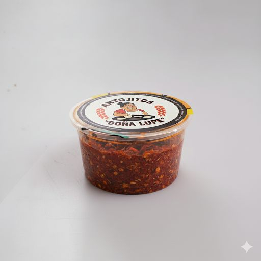 Chile seco, ajo y cebolla fritos, con un poco de jitomate. Todo doradito y frito. Picosita, ahumada y bien sabrosa. De las que te hacen pedir mas.