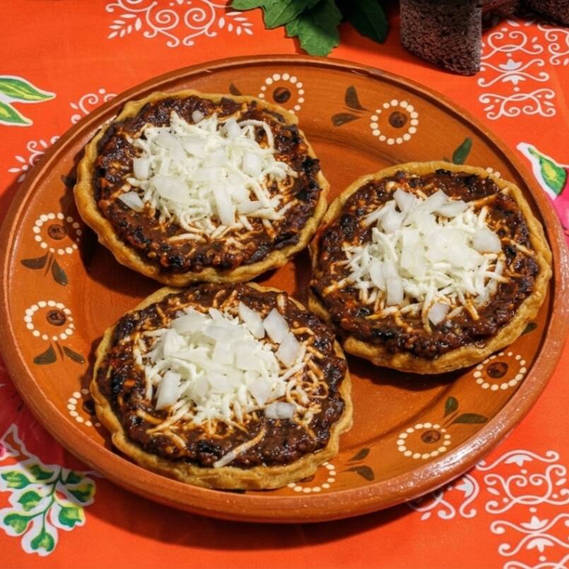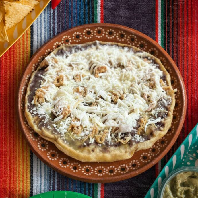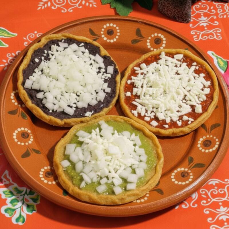 Masa recién hecha, pellizcada en las orillas y doradita al comal. Untada con frijoles refritos, lleva chicharrón o papita y su buen queso rallado por encima. Sencilla, casera y sabrosa, justo como nos gusta.