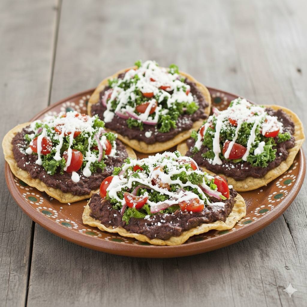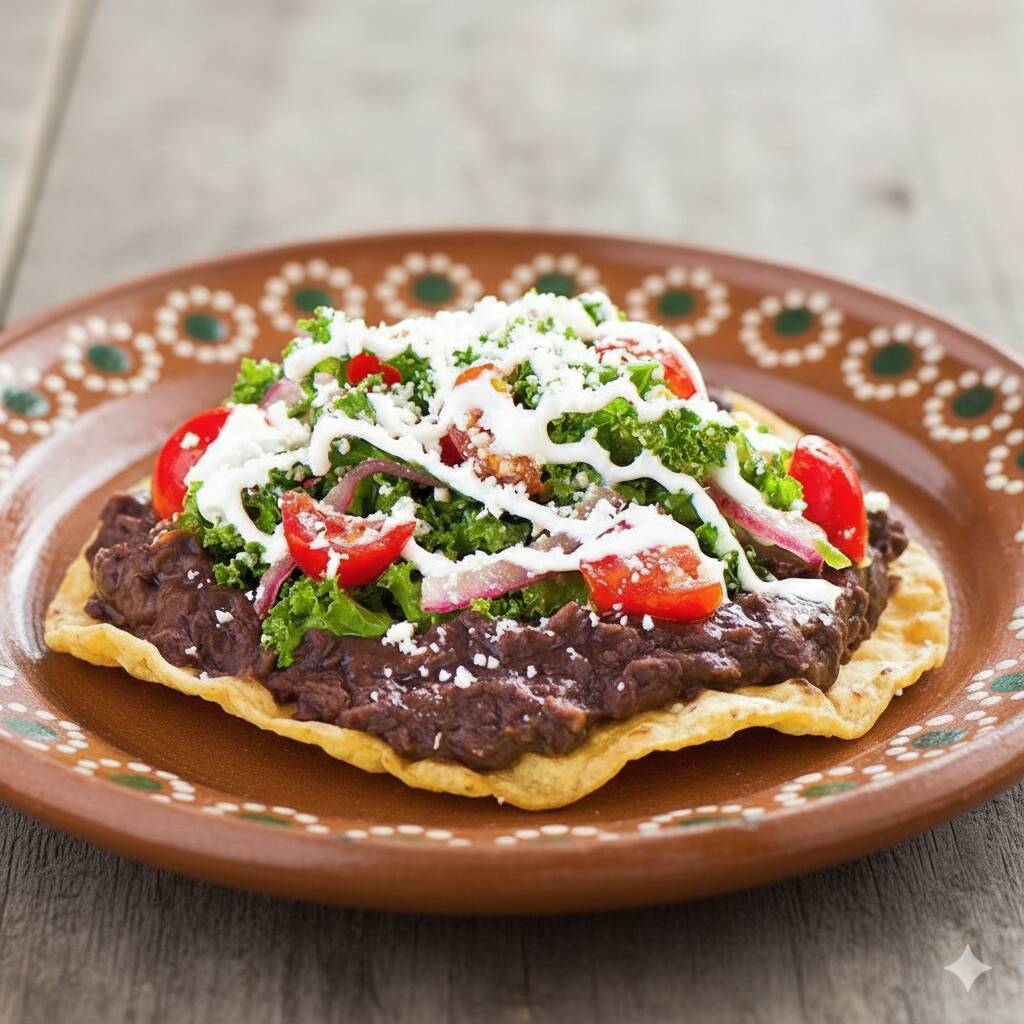 Tortilla frita, cubierta con frijoles, queso de hebra, rodajas de jitomate fresco, lechuga, crema y queso rallado. Un clásico sabroso y lleno de frescura.