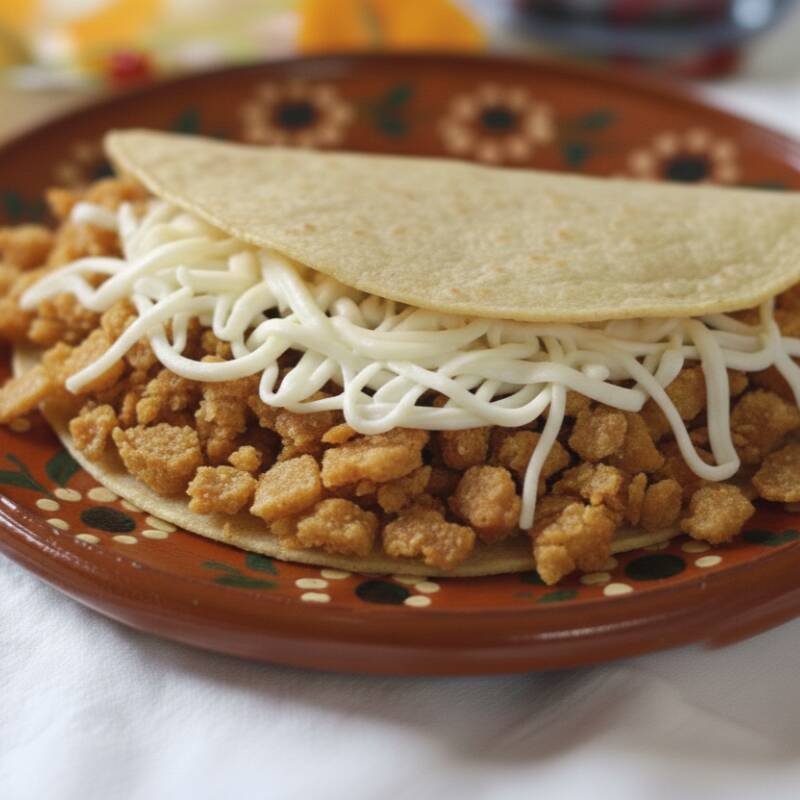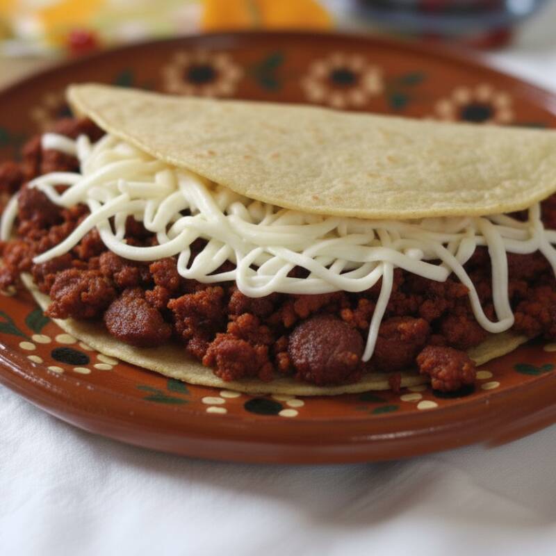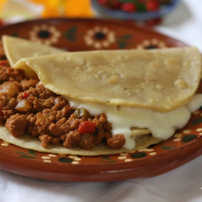Tortilla al comal, rellena con queso de hebra derretido y picadillo de res guisado con jitomate y cebolla. Bien calientita y con ese sabor casero que se antoja.