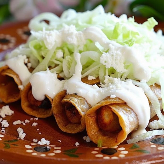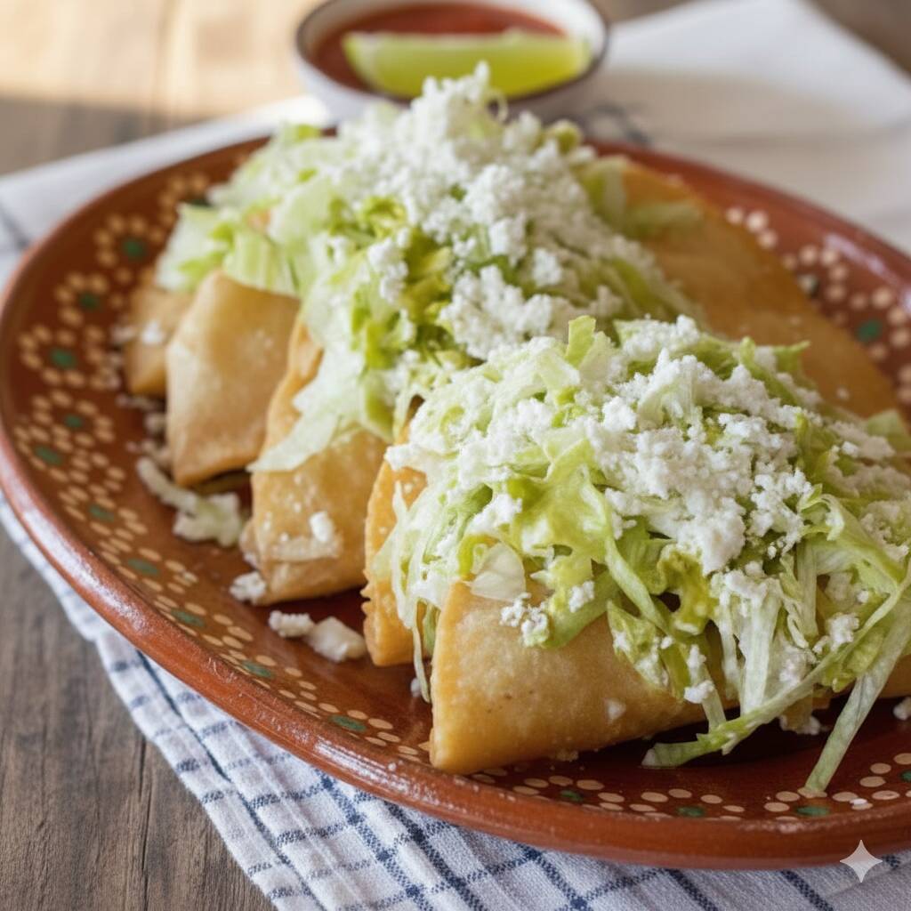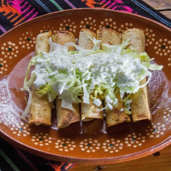 Relleno de pollo deshebrado bien sazonado, envuelto en tortilla doradita y crujiente. Lo servimos con lechuga fresca, crema, queso rallado y salsa al gusto. El sabor casero de siempre, directo de la cocina de Doña Lupe.